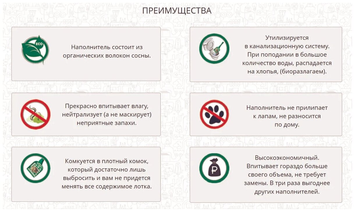 | Плюсы: | Нет пыли, утилизируется в унитаз. Хорошо впитывает запах |