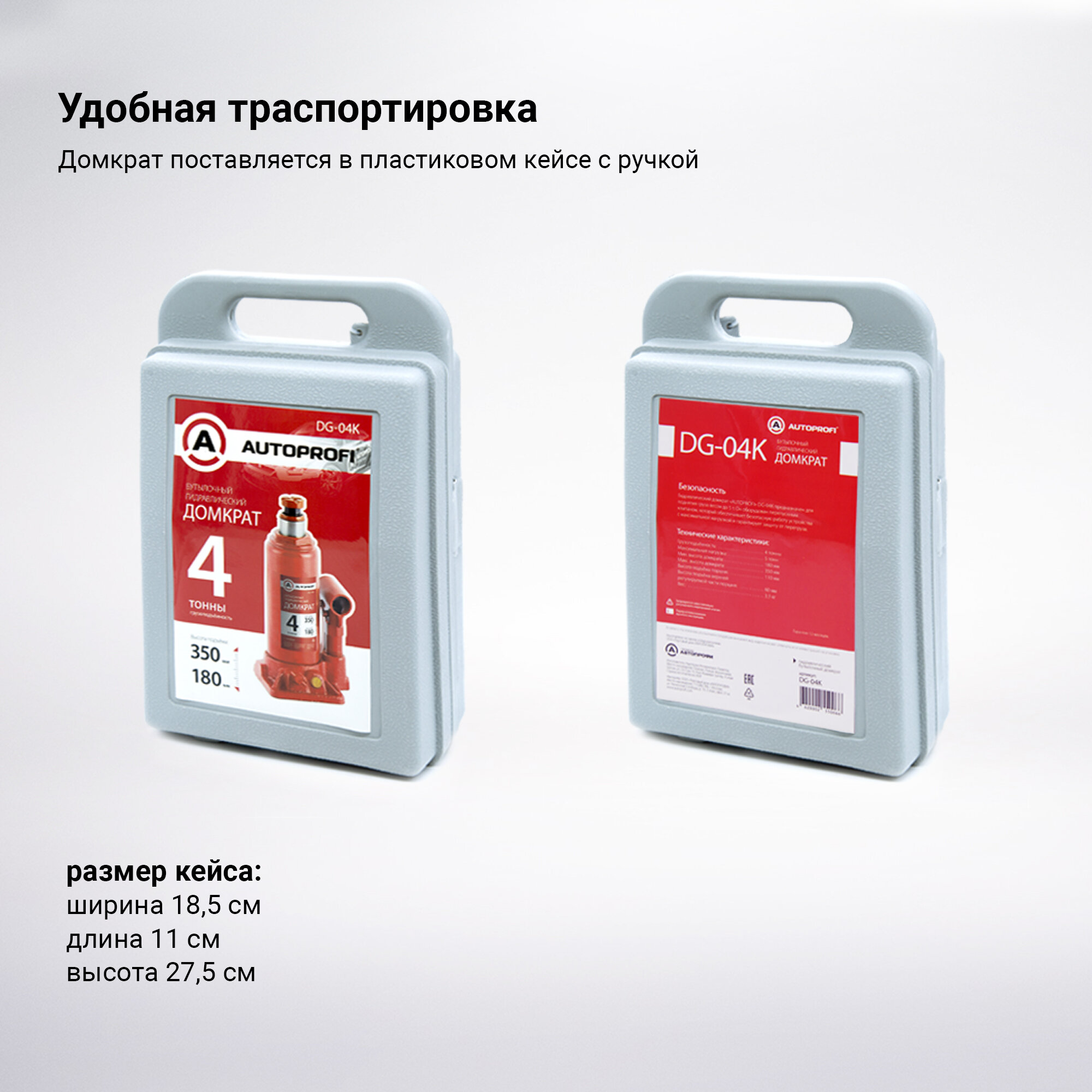 AUTOPROFI DG-04K Домкрат бутылочный AUTOPROFI, гидравлический, 4 тонны, защита от перегруза, высота подъёма 180 - 350 мм., в кейсе