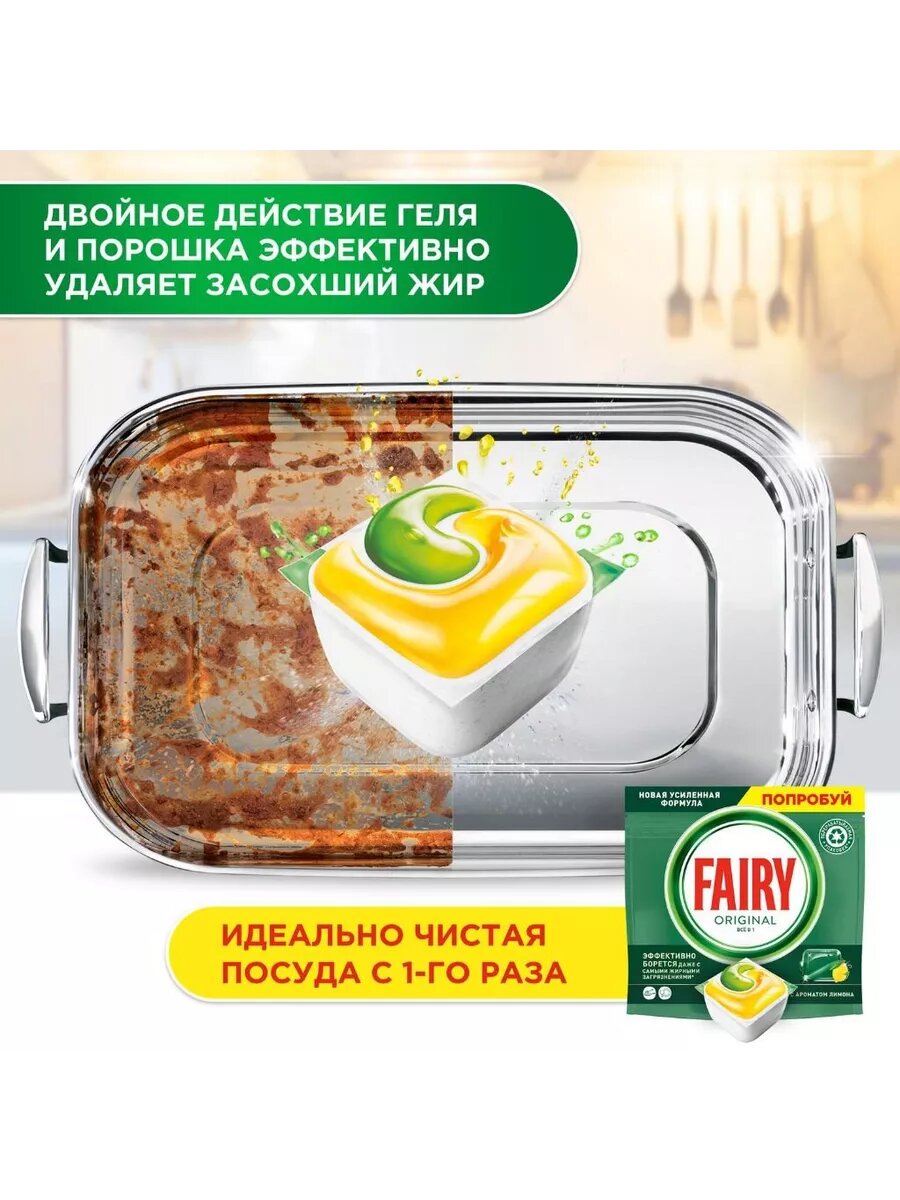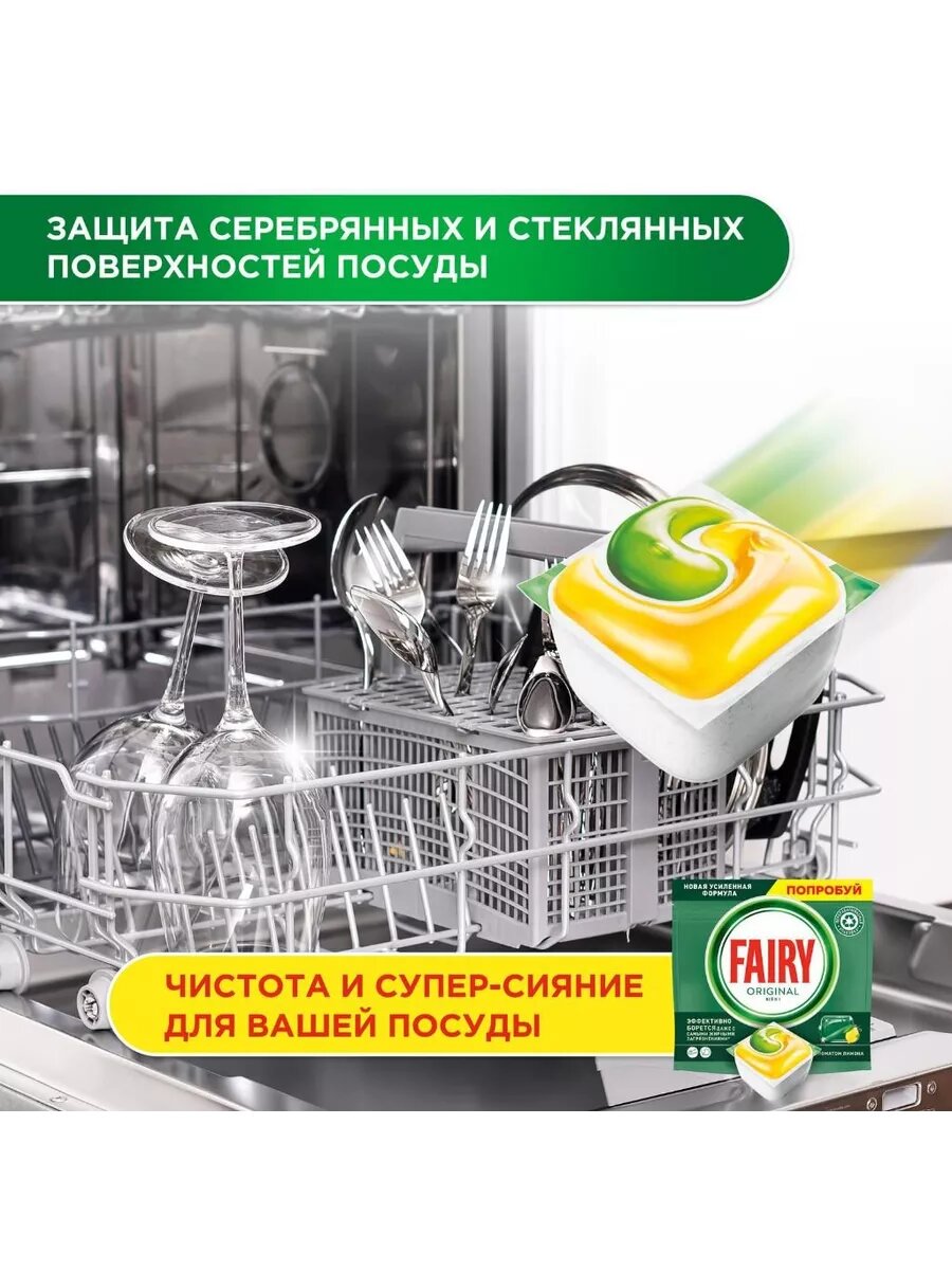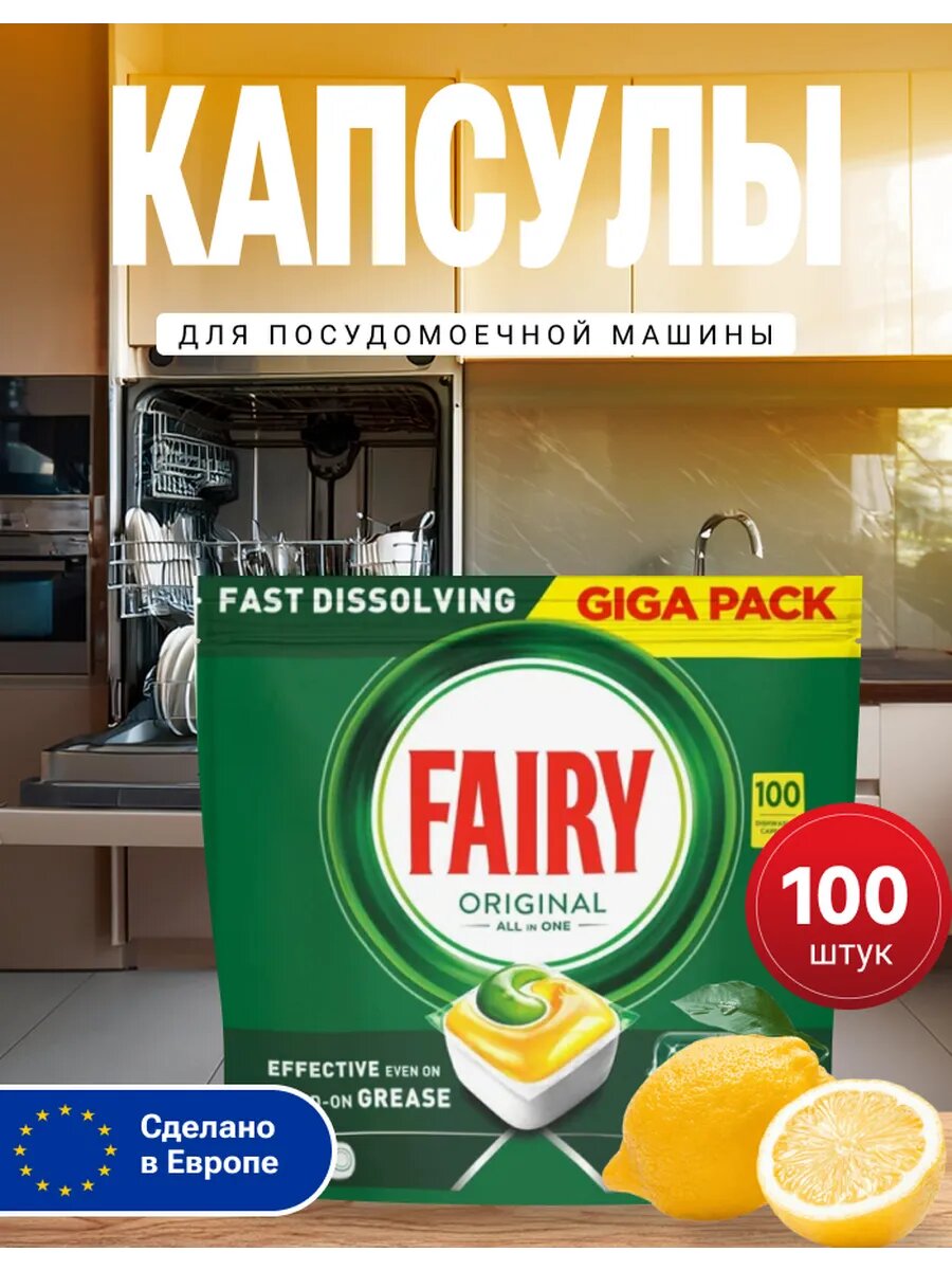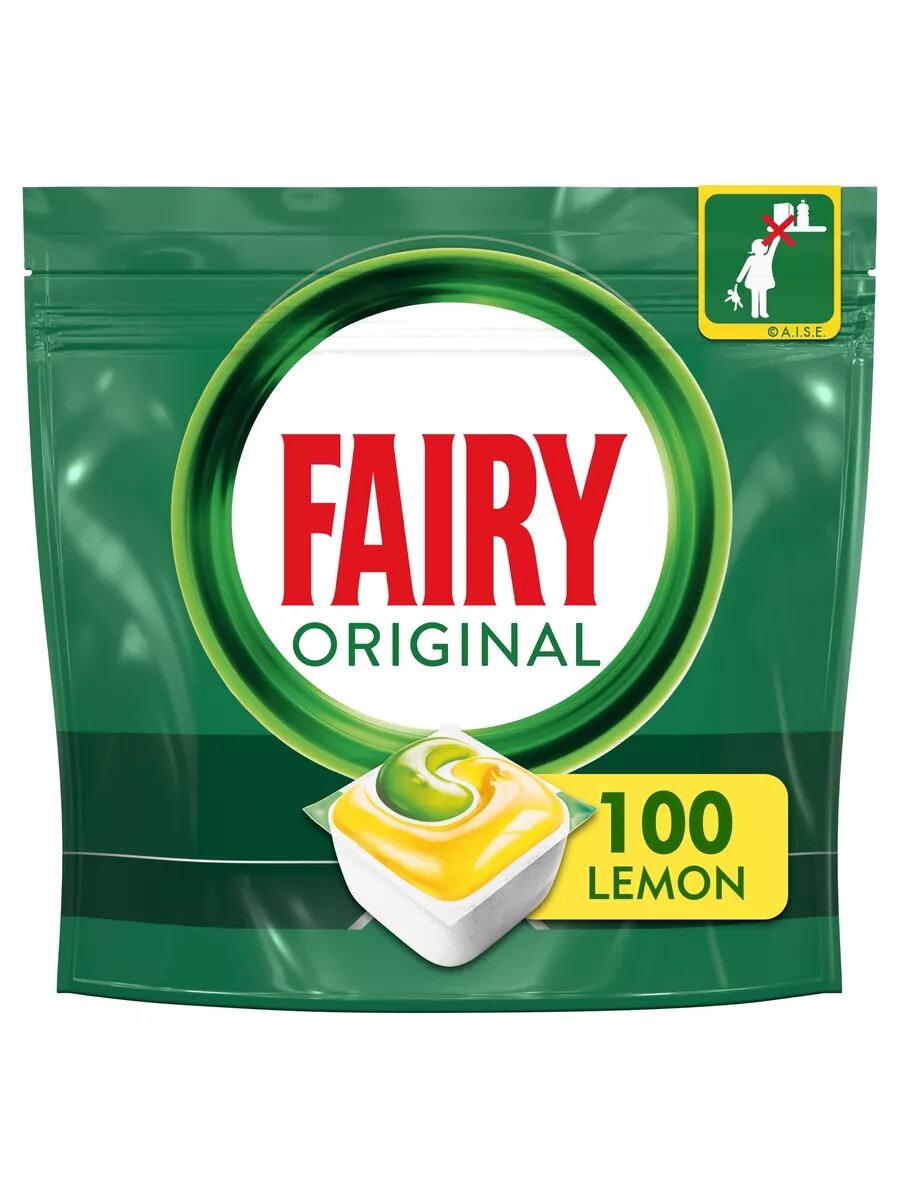 Купить Капсулы для посудомойки Fairy Original Lemon 100 штук, бесфосфатные, удаляет накипь