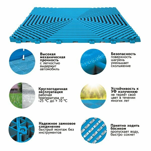 | Плюсы: | Покупался как "пешеходные" дорожки и площадка, на земляное покрытие. Основание подготовили, но без фанатизма (выровняли землю, засыпали песком, выровняли, утоптали). Укладывать очень удобно, крепления крепкие (ни одно не сломалось в процессе укладки и переделок). Ширина тоже удобная: 2 плитки дают широкую дорожку (практически площадку), одна - узкую, но удобную и проходимую для 1 человека. Результатом очень довольна: песок просыпается через решетки, вода уходит, ходить стало намного удобнее и чище! Рекомендую, если нет возможности заморочиться с чем-то основательным - очень достояная замена. |