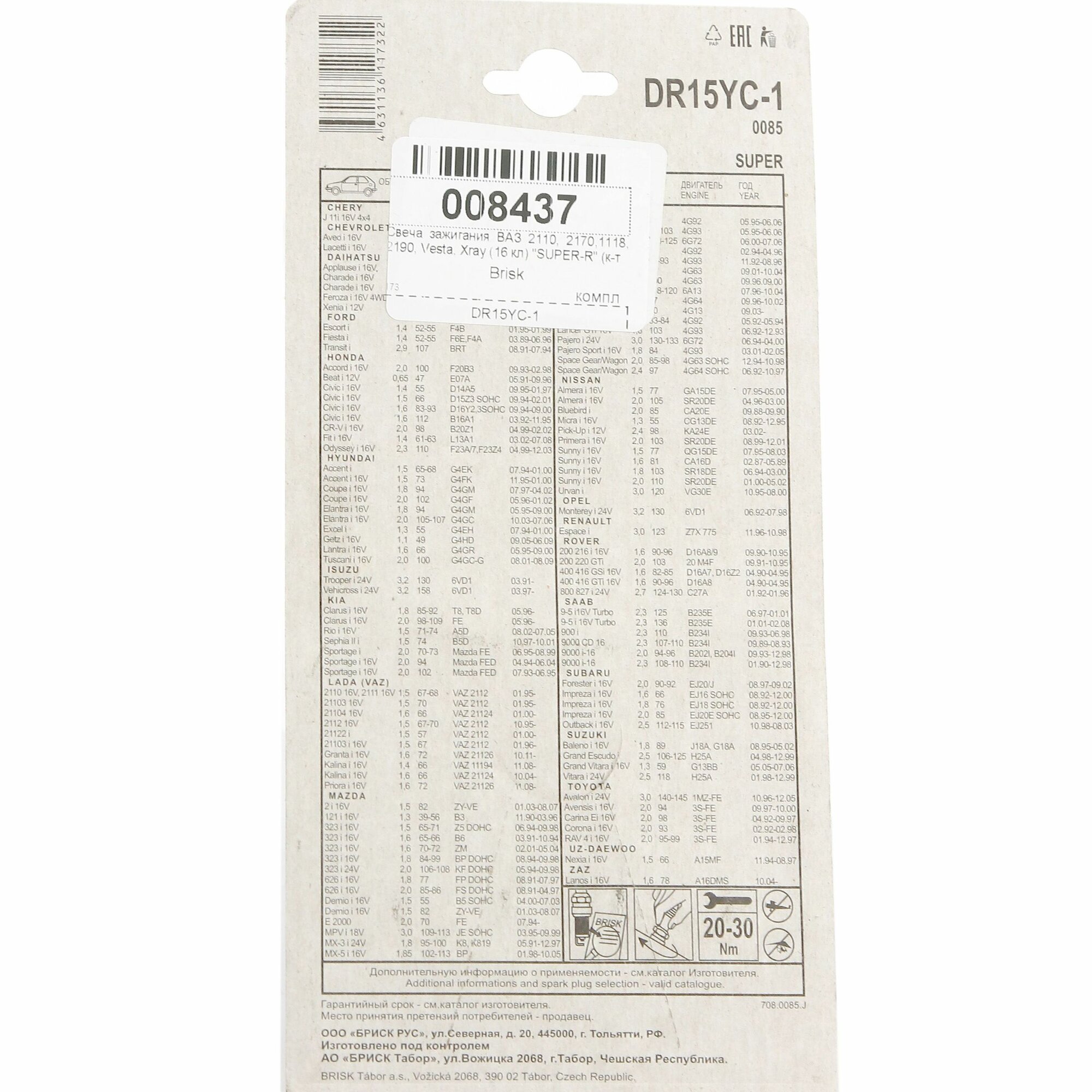 Свечи зажигания ВАЗ-2110,2170,1118,2190,Vesta,XRAY (16 кл) к-т 4 шт, Brisk, "SUPER-R" DR15YC-1