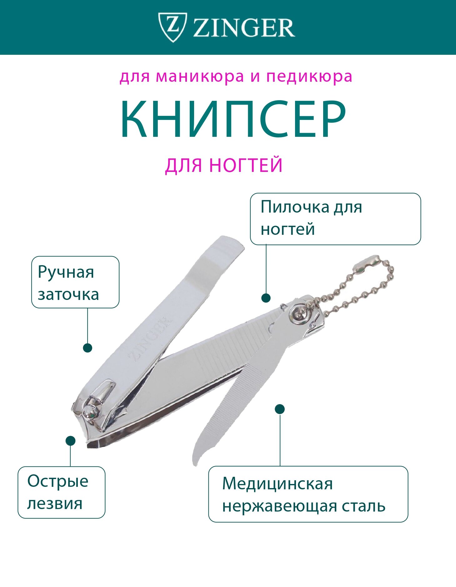 Книпсер для ногтей Zinger большой с цепочкой и пилкой SLN-604-FC