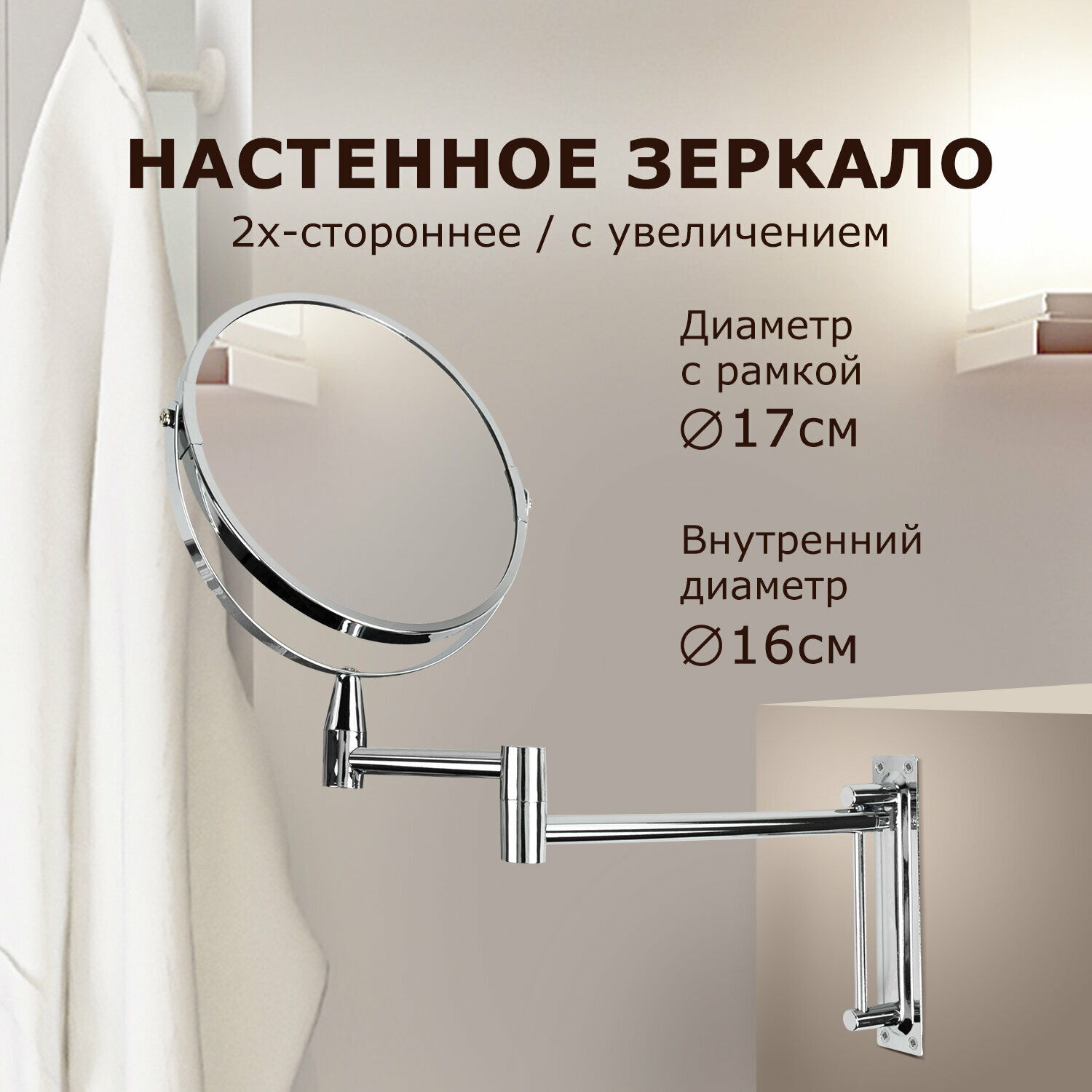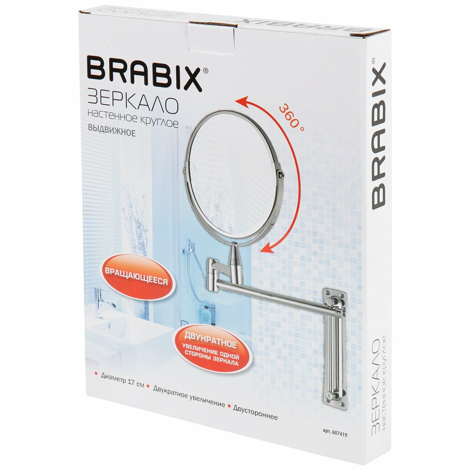 Купить Зеркало настенное для ванной комнаты / для декора интерьера Brabix, диаметр 17 см, двусторонее, с увеличением, нержавеющая сталь, выдвижное (петли)