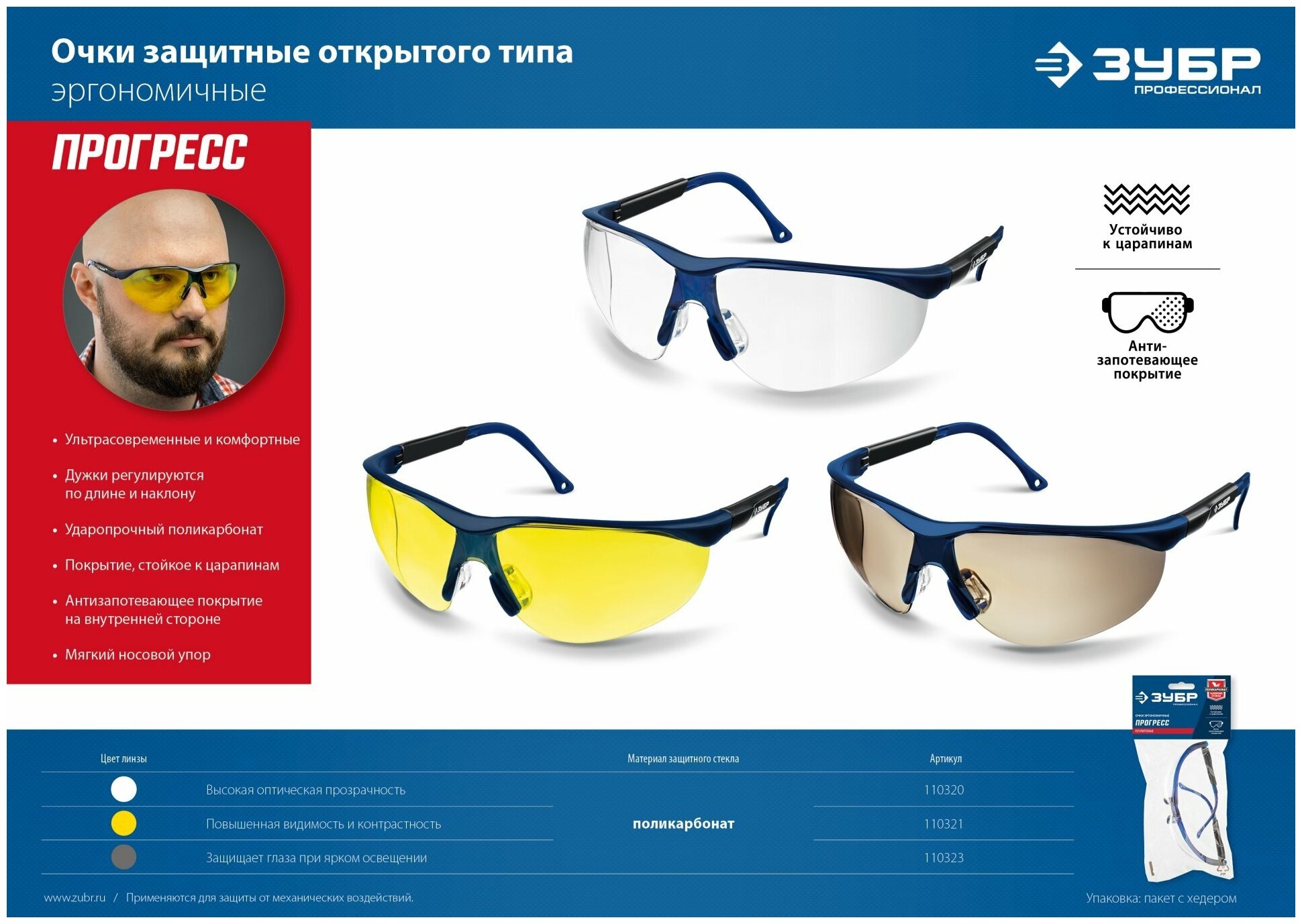 Защитные прозрачные очки ЗУБР прогресс линза устойчива к царапинам и запотеванию, открытого типа (110320_z02)