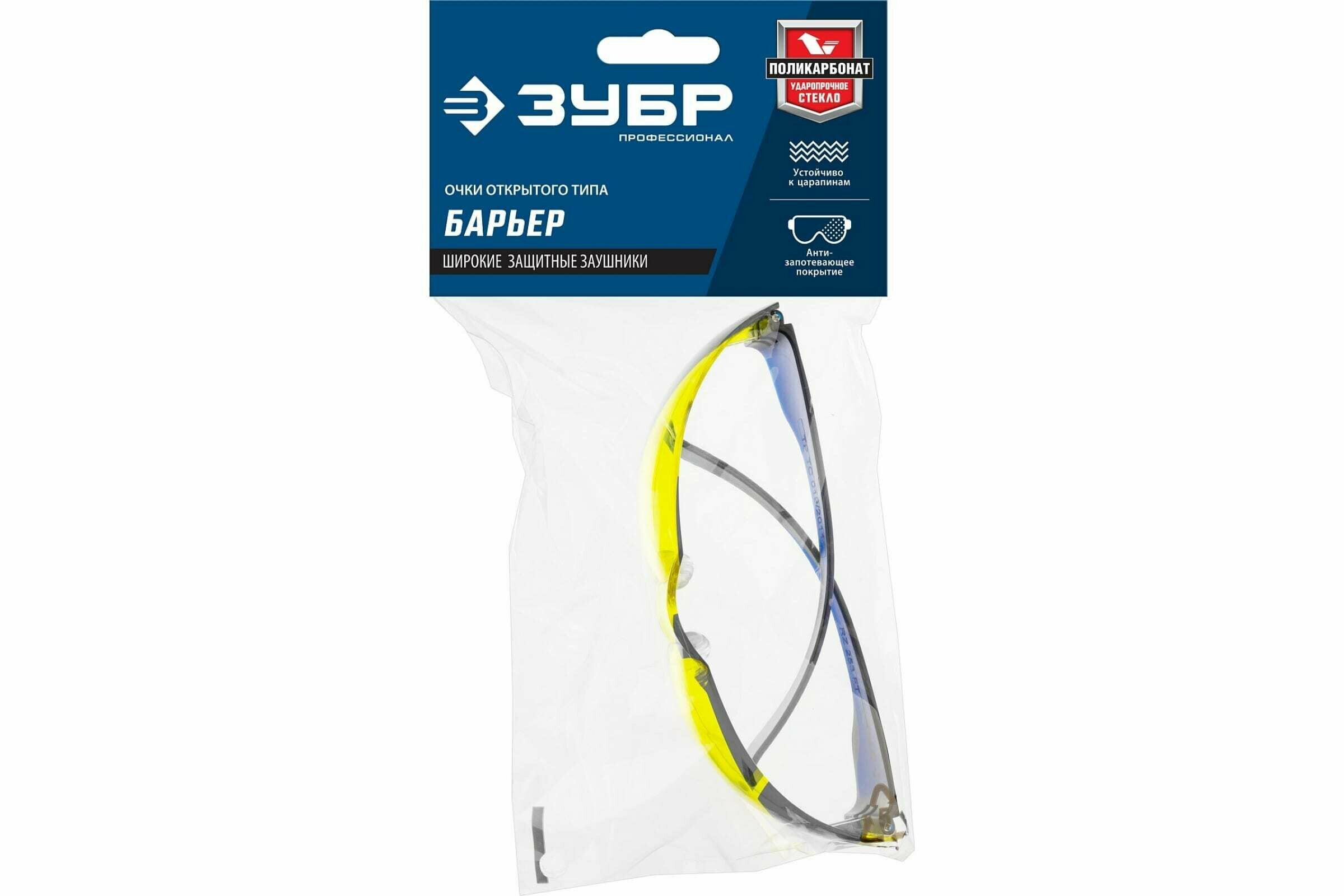 ЗУБР БАРЬЕР, открытого типа, прозрачные, облегчённые, линза устойчивая к царапинам и запотеванию, защитные очки, Профессионал (110487)