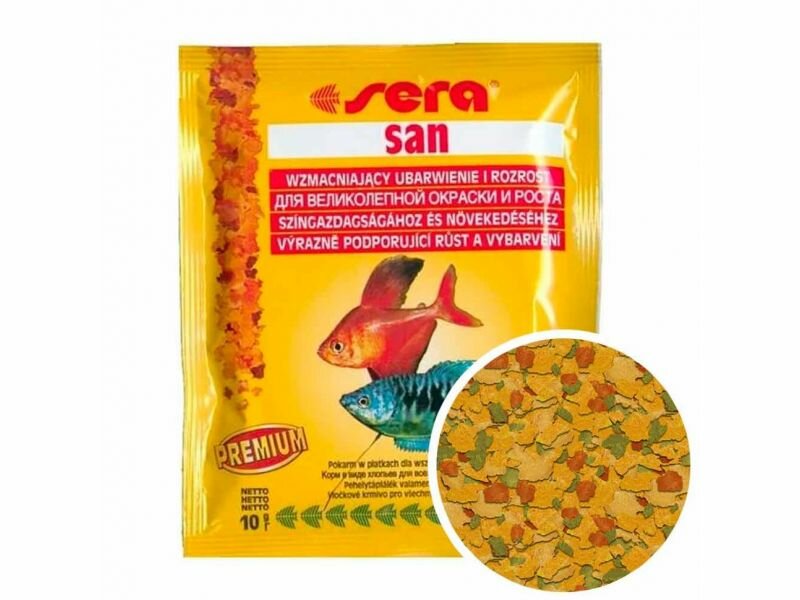 Sera (Сера) San Корм для усиления окраса всех тропических рыбок 10 г (хлопья, пакет саше)