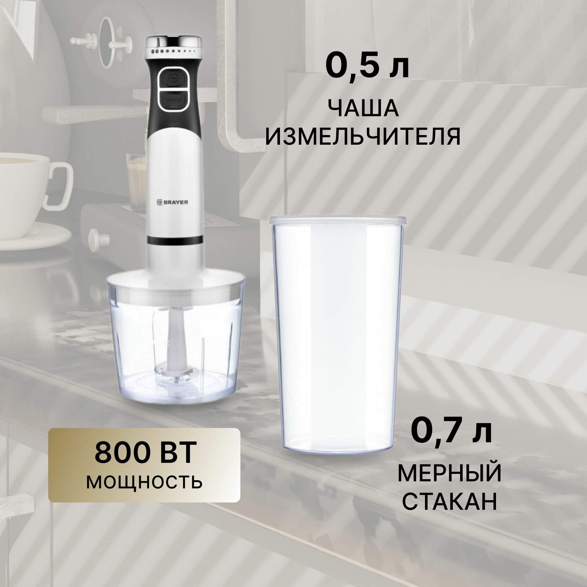 Блендер погружной BRAYER BR1242, 800 Вт, 2 режима, измельчитель, венчик, стакан, белый