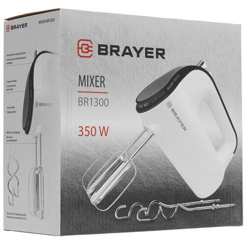 Brayer 1300BR Миксер350 Вт, 5 скорост, 2 венчика, 2 насадки для замеса, Turbo, белый .