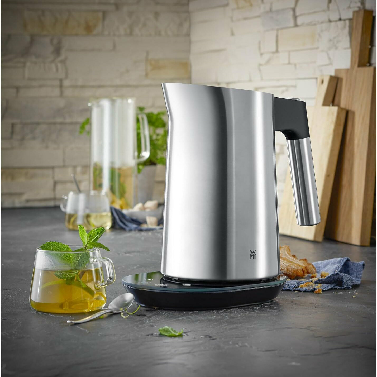 Электрический стеклянный чайник WMF Kitchenminis Vario 1 л, c 5 температурными режимами, съемным ситом для чая, Led подсветкой, из нержавеющей стали Cromargan и термостойкого стекла, 1900 Вт