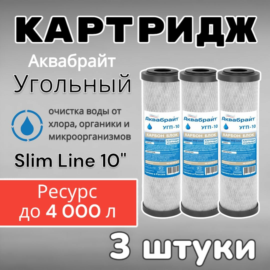 Купить Картридж угольный Аквабрайт УГП-10 (3 шт), для очистки воды от хлора и органических соединений, Карбон Блок (SL10)