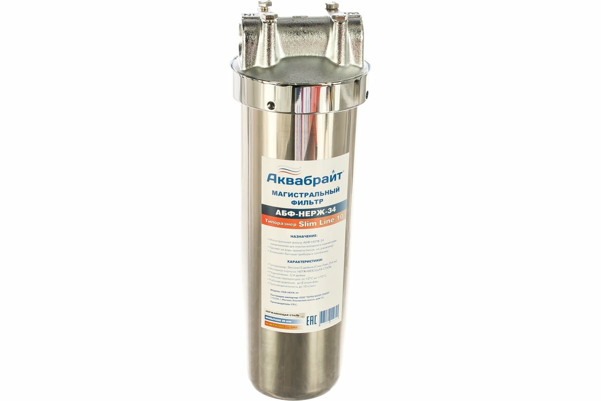 Магистральный фильтр Аквабрайт АБФ-НЕРЖ-34, Slim Line 10", 1/2"