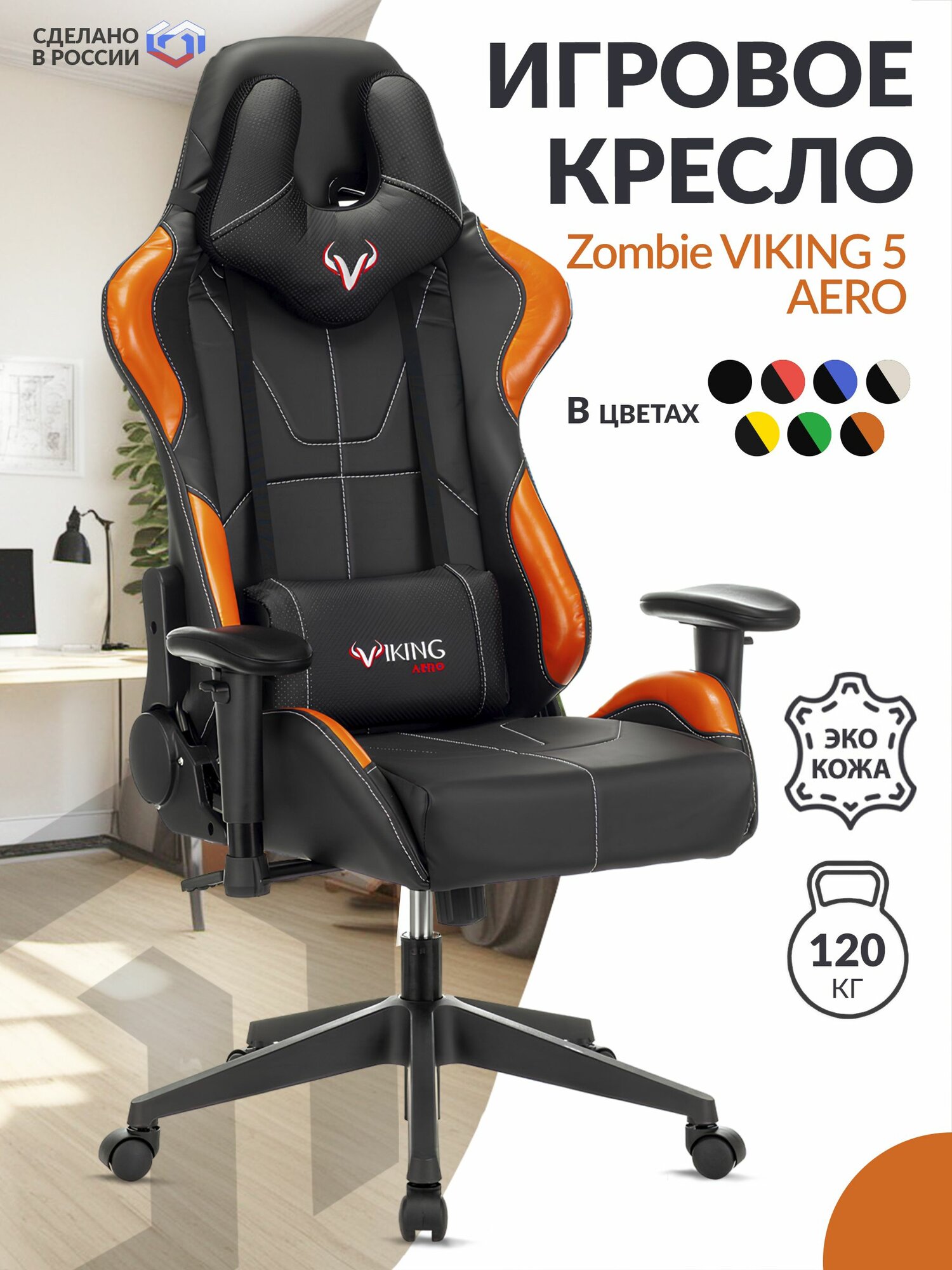 Кресло игровое Zombie VIKING 5 AERO черный/оранжевый искусственная кожа / Компьютерное геймерское кресло, с подголовником, крестовина пластик