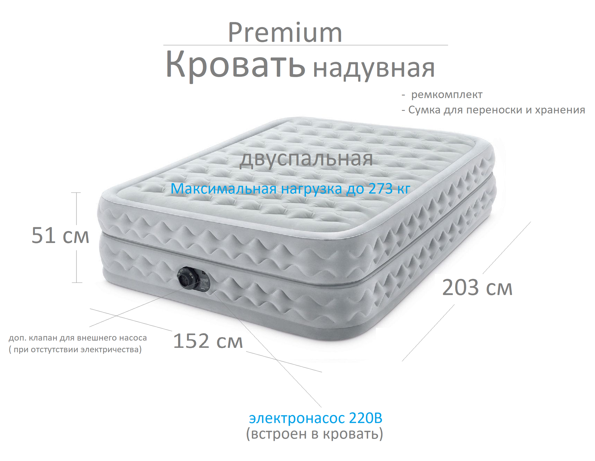 СохранитьНадувная Premium кровать двуспальная 152х203х51см, встроенный электрический насос 220В, Intex Supreme Air-Flow Airbed 64490 интересное: