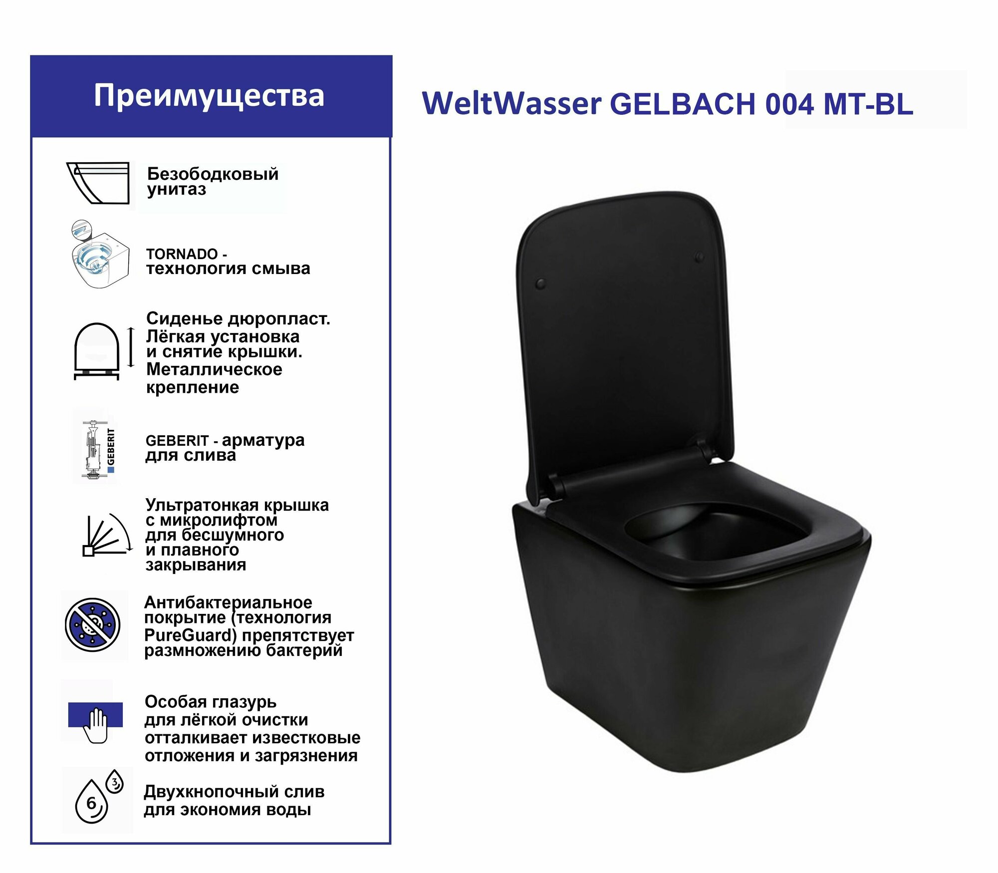 Ниже Вы можете прочитать отзывы на Безободковый подвесной унитаз Weltwasser GELBACH черный матовый , сиденье с микролифтом, ознакомится с подробными характеристиками, посмотреть интересные обзоры и фотографии на Безободковый подвесной унитаз Weltwasser GELBACH черный матовый , сиденье с микролифтом.