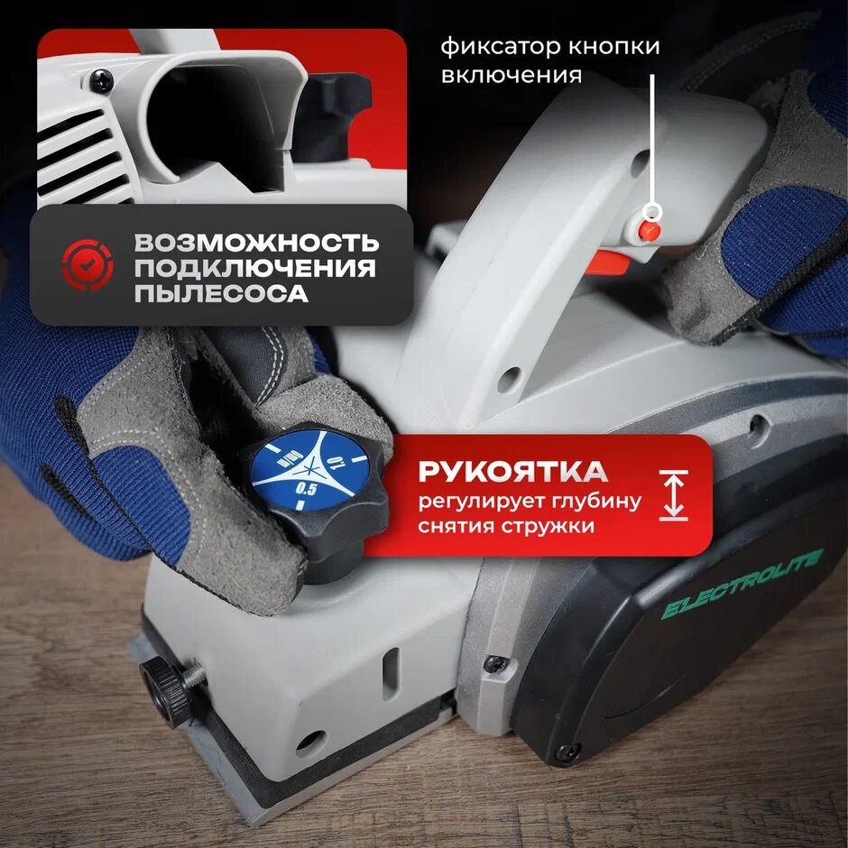 Рубанок электрический / Фуганок для строгания дерева ELECTROLITE P-750 ( 750 Вт, 220 В Ширина 82 мм, ручной, присоединение пылесоса) Электрорубанок