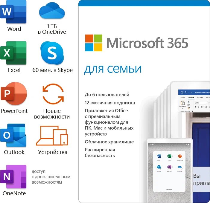 Купить MICROSOFT OFFICE 365 для семьи 6 месяцев для России