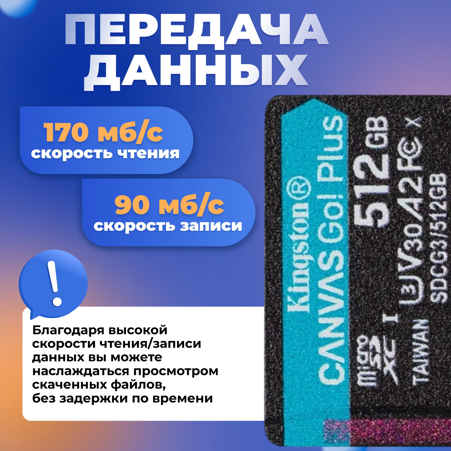 Карта памяти Kingston Canvas Go Plus SDCG3/512GB microSDXC/емкость 512 Гб запись/чтение 90МБ/с/170МБ/с