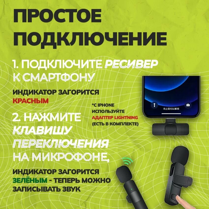 Микрофон петличный беспроводной, с шумоподавлением, петличка, для мобильного телефона, разъем Lightning, для Iphone, черный, 2шт