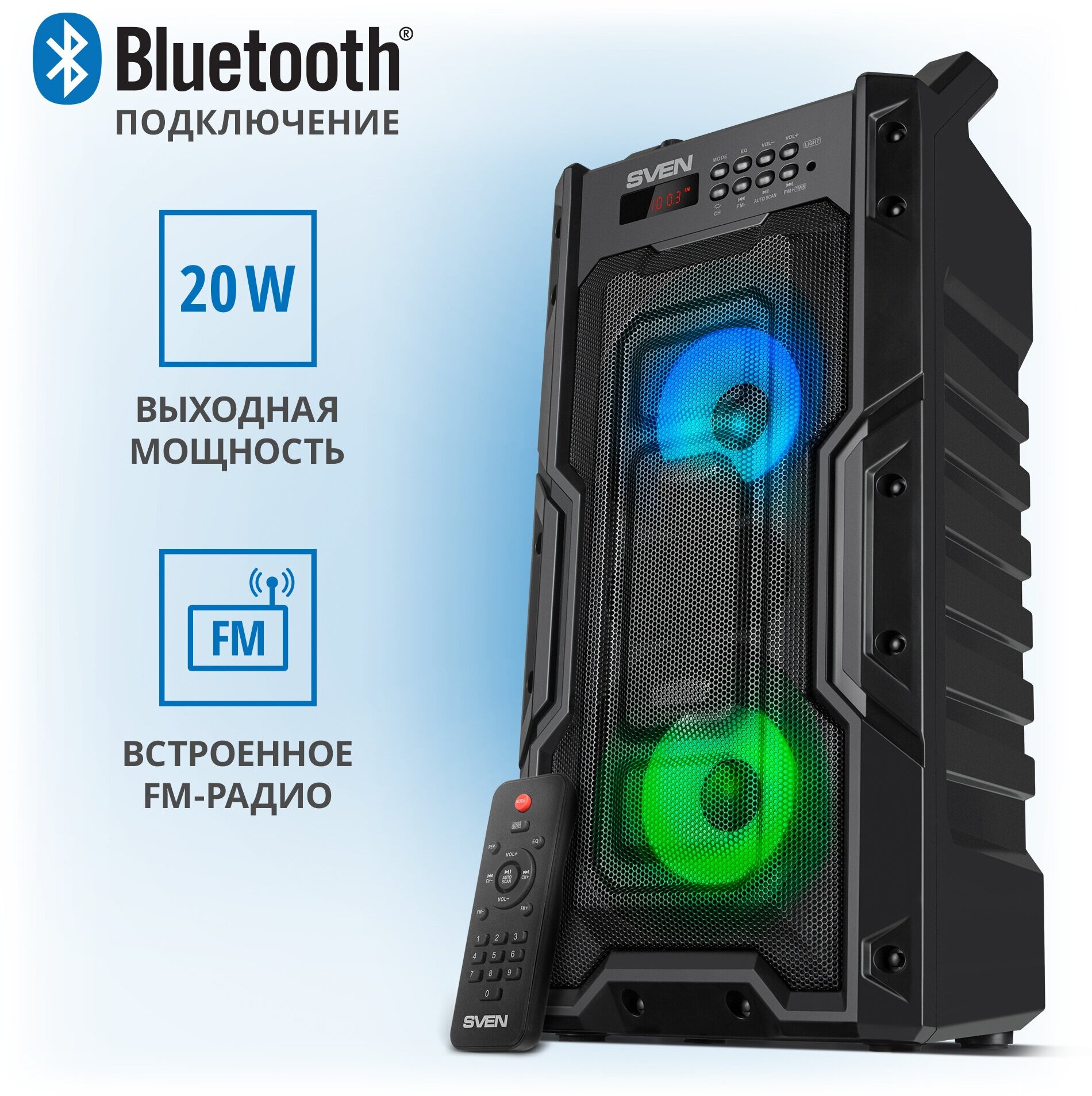 Колонка портативная беспроводная bluetooth SVEN PS-435, переносная с радио и ручкой для переноски / Колонка блютуз музыкальная акустическая с подсветкой / 20 Вт / TWS / USB / microSD / LED-дисплей / пульт / вход для караоке микрофона