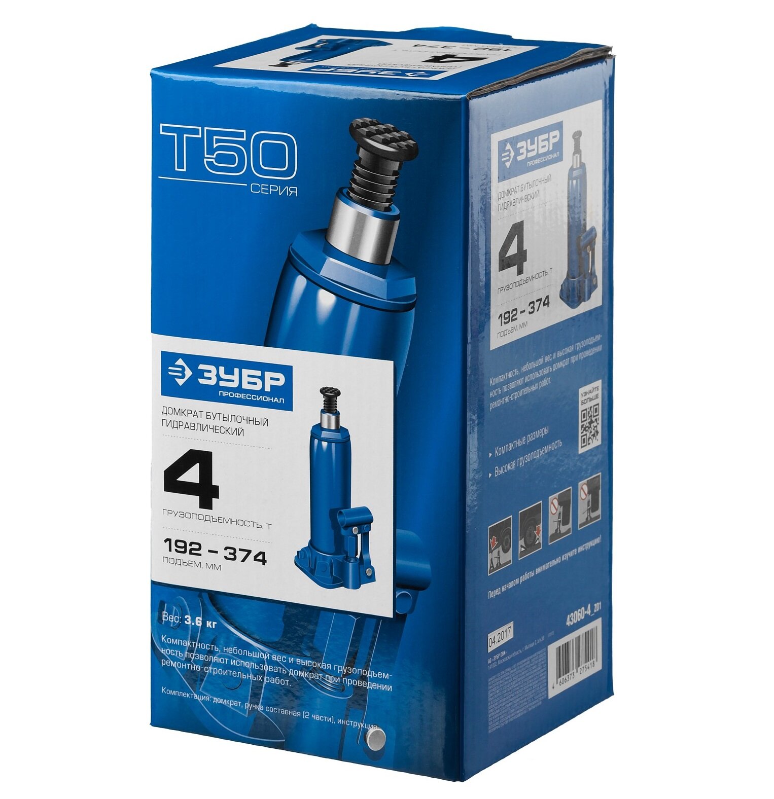 ЗУБР Домкрат гидравлический бутылочный T50, 4т, 192-374мм, Профессионал 43060-4 43060-4_z01