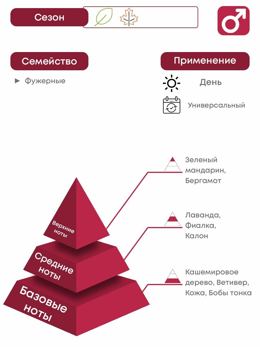 Приятные табачные нотки и аромат выделанной кожи. Духи "ближнего радиуса действия", зато женщин поражают наповал :) |