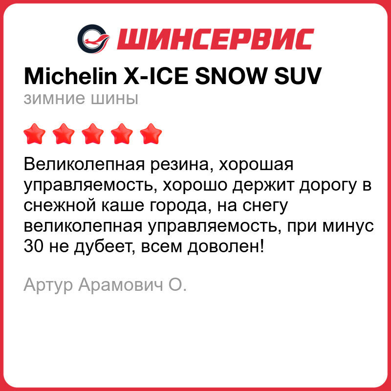 | Отзыв: | Во-первых, реально очень низкий уровень шума. Я 10 лет ездил на летних Континенталях и зимних Якогамах на пежо 3008 и каждый раз в межсезонье примечал разницу по уровню шума в салоне авто, когда обут в премиальные Континентали и среднечковых не шипованные Якогамы. В 2020 поменял старый пежо 3008 на новый и уже на летних Мишленах в машине оказалась полная тишина, в этот момент было решено покупать зимние только Мишлен. Купив Мишлен Икс айс Сноу с подарками от Мишлен я ни на секунду не пожалел что отдал 33 тысячах деревянных и как же я удивился что тишина в салоне осталась как на летних Мишленах.