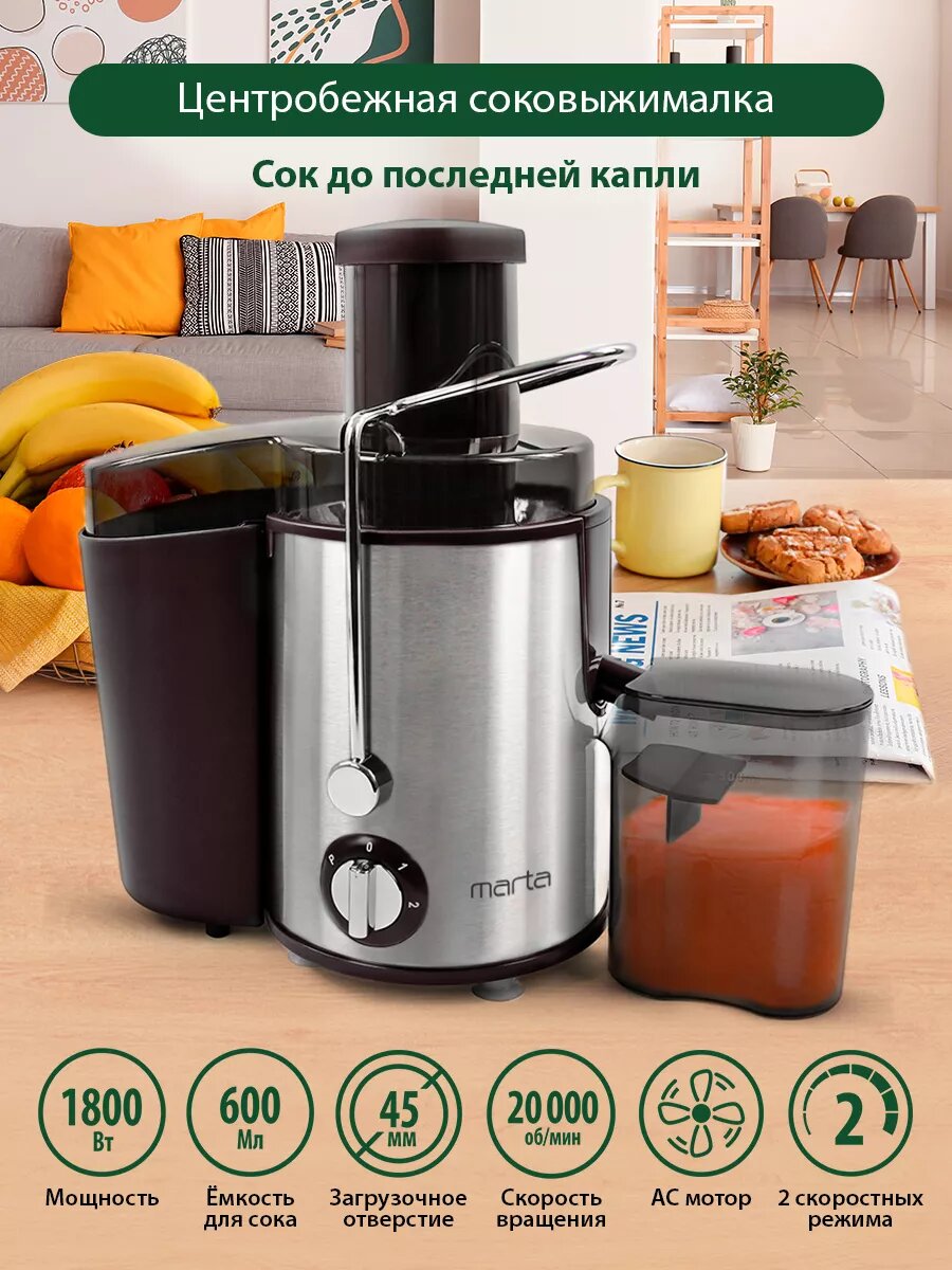 Соковыжималка Marta MT-2048, чёрный жемчуг, 1200 Вт, 2 скорости, объем стакана - 600 мл
