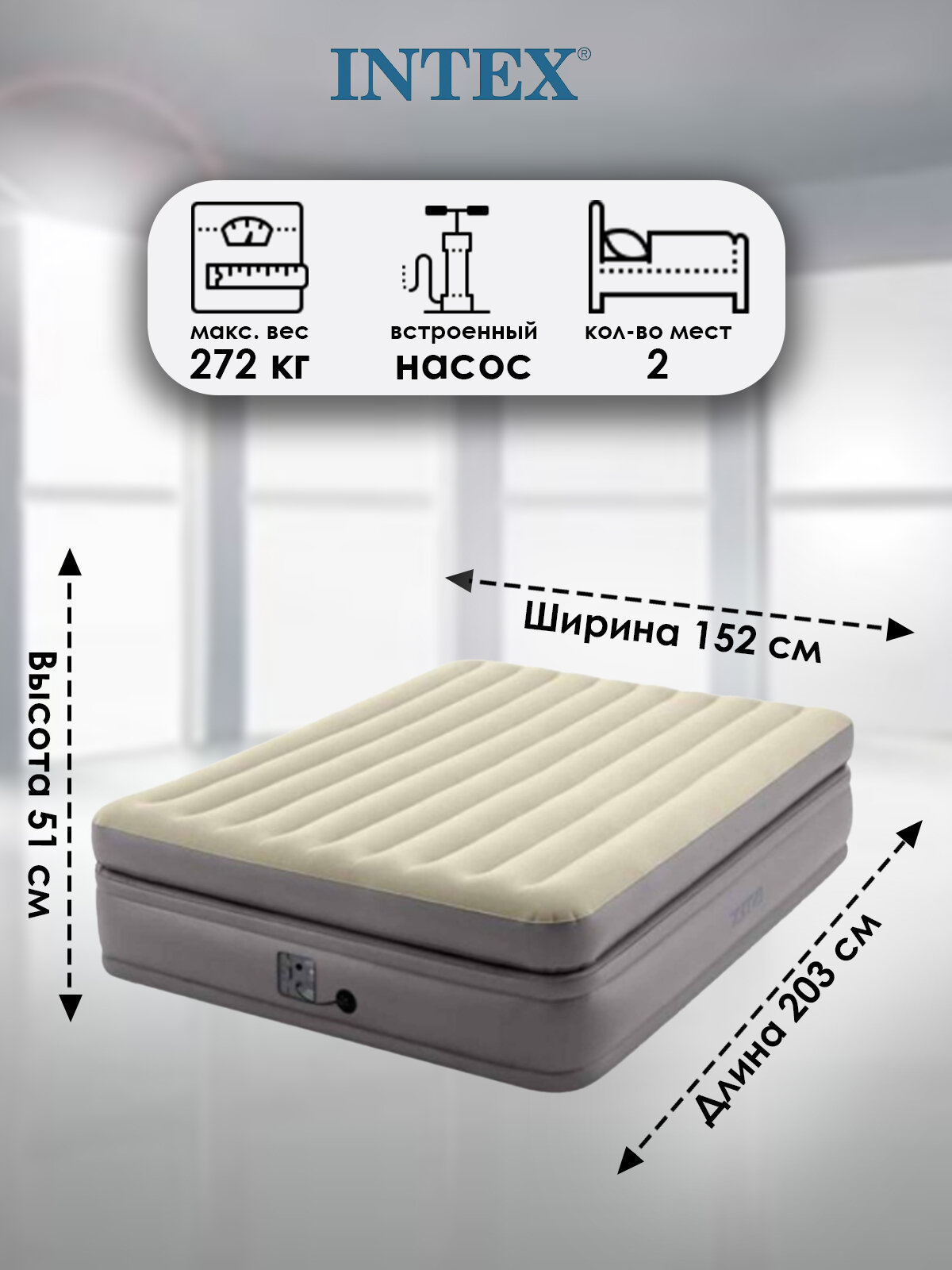 Надувная кровать Intex 152х203х51 см ''Prime Comfort'' встр. насос, 220В, до 272 кг