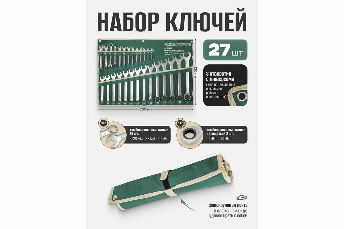 Набор ключей комбинированных ROCKFORCE 27пр.(6-28,30,32мм+ключи трещоточные:10,13мм), на полотне /1 интересное: