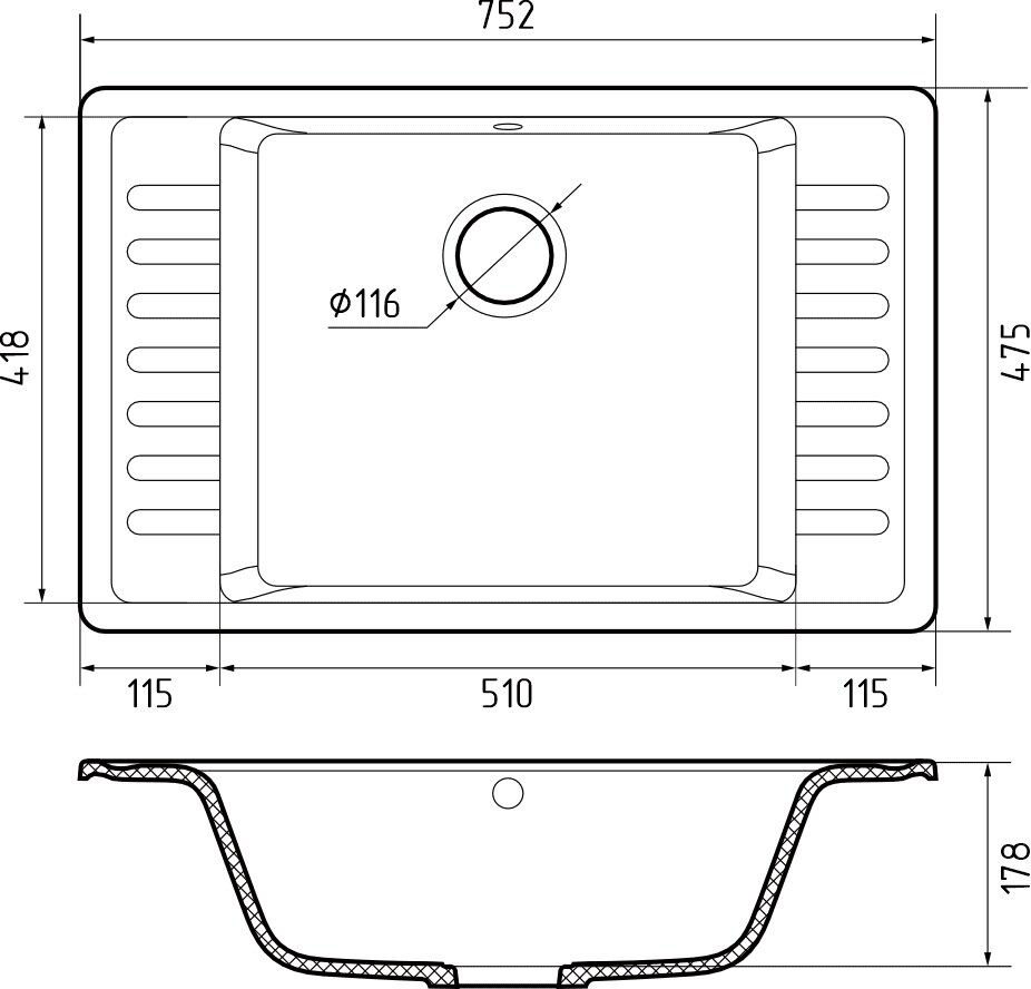 GranFest QUARZ Мойка чаша+кр 752*475 (черный) арт.GF-ZW-