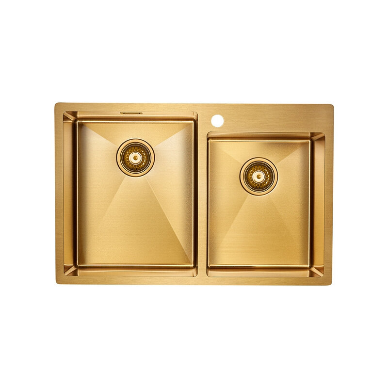 Мойка для кухни из нержавеющей стали AISI 304 PVD Paulmark NEXT-SKEW 74х44 врезная / подстольная, брашированное золото, сифон, PM887444-BG