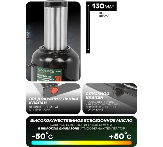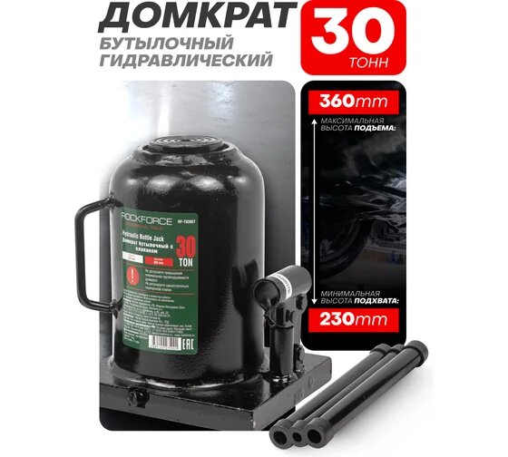 ROCK-FORCE RFT93004DISCOUNT Домкрат RF-T93004 бутылочный 30т(высота подхвата - 285мм, высота подъема - 465мм, ход штока - 180мм) ROCKFORCE /1 «ремонт»