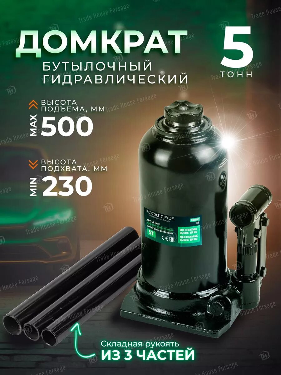 Купить Домкрат гидравлический RF-TH805001BIG бутылочный с клапаном 5т (выс.подъема 230-500мм) ROCKFORCE 1, ROCK FORCE RFTH805001BIG (1 шт.)