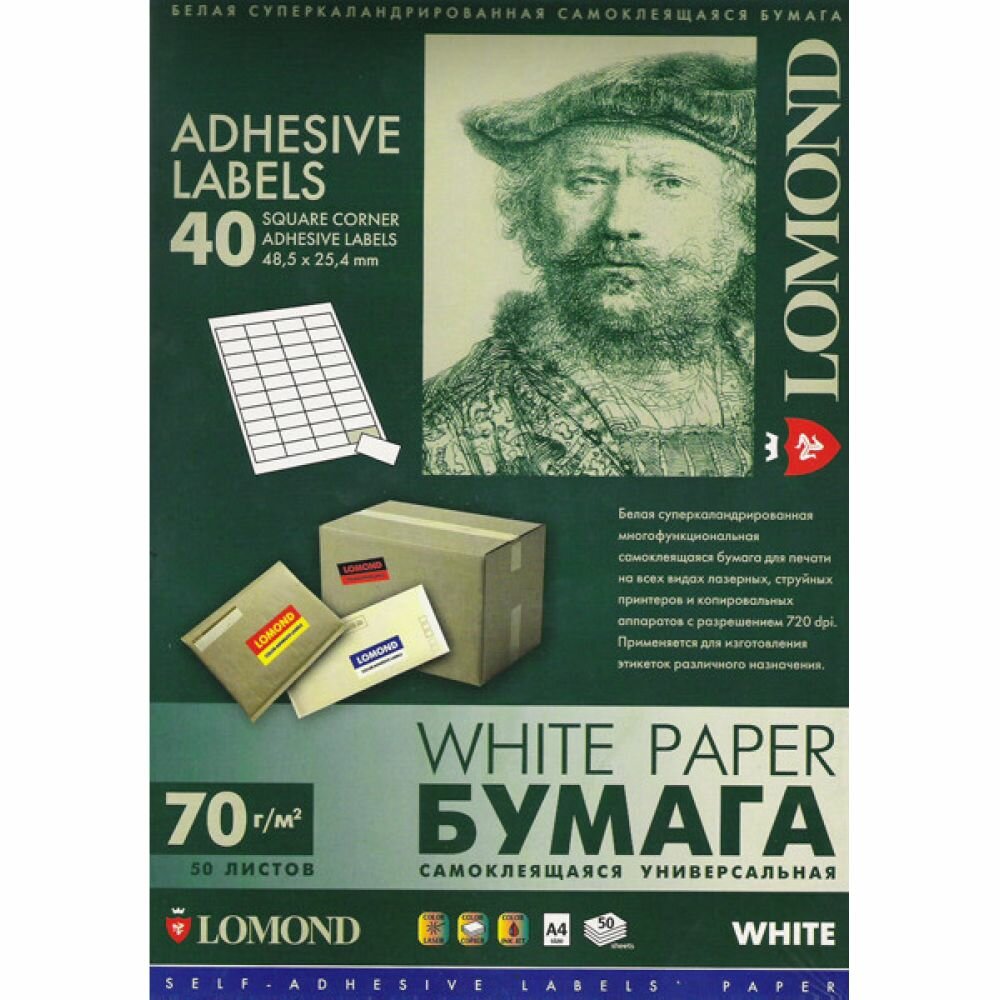 40 делений (48,5мм х 25,4мм) самоклеющаяся бумага, 70 г/м2, А4, 50 листов, Lomond 2100195