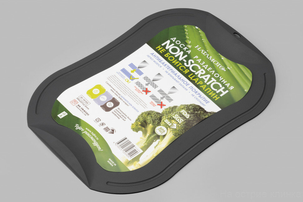 Производитель - Япония, геометрия правильная, никаких острых углов, на столешнице лежит не шелохнувшись, резать удобно