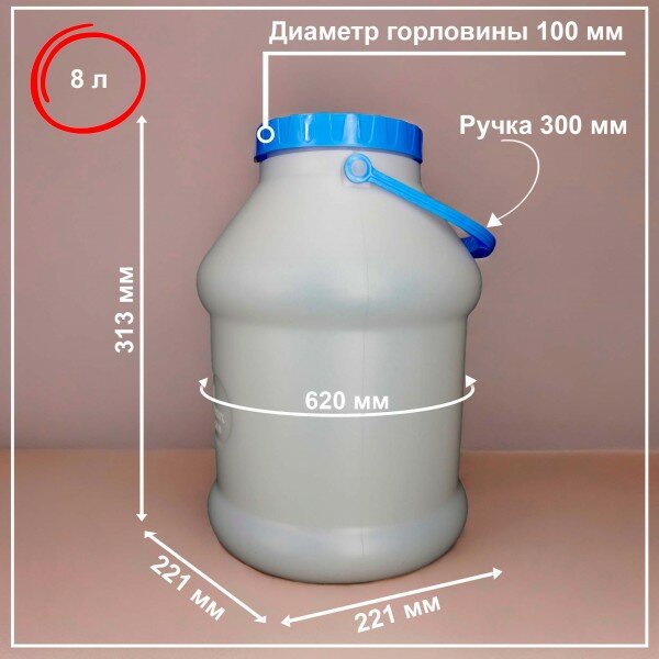 Входит 10 кг, больше не наливал. Ручки хлюпковаты, но выдерживают. Крышка не плотная, фиксирую скотчем крышку и ручки. Внутри бидон обязательно нужно мыть - кусочки пластмассы и запах пластика. Полностью от запаха мытье не спасает, но лучших бидонов в продаже для такой фасовки пока нет. |