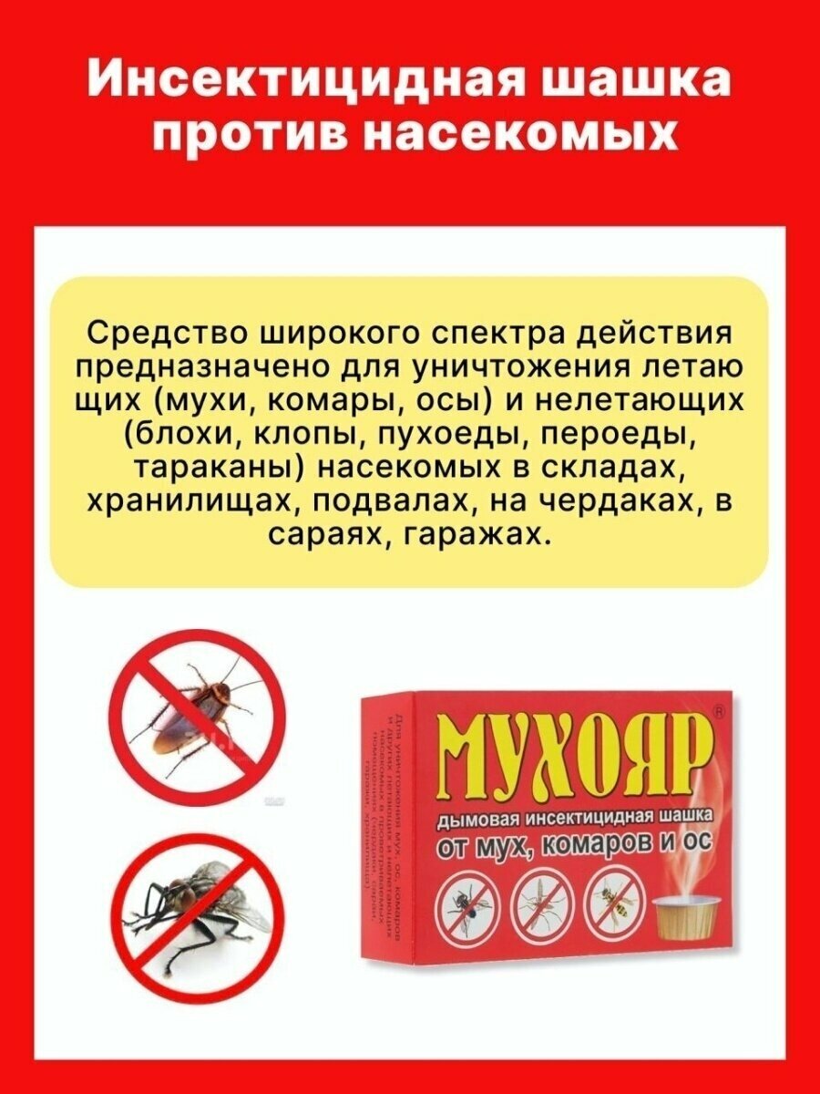 Ниже Вы можете прочитать отзывы на Мухояр дымовая шашка от мух, комаров и ос 50 г (комплект 5 шт), ознакомится с подробными характеристиками, посмотреть интересные обзоры и фотографии на Мухояр дымовая шашка от мух, комаров и ос 50 г (комплект 5 шт).