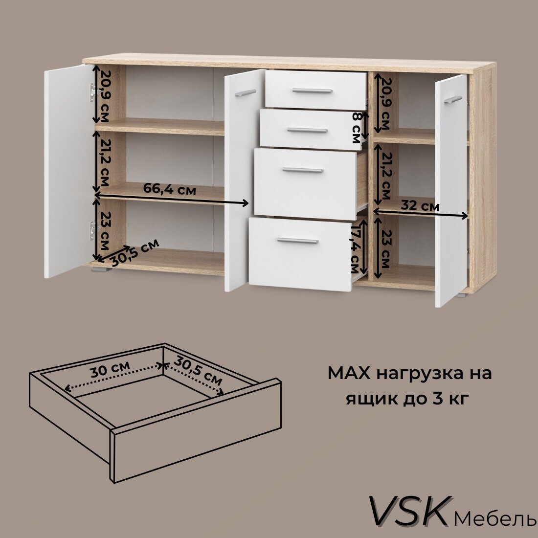 Штерн (STERN) комод Т-4, 140,3 х 89,5 х 43,3 см, 4 ящика, 2 двери, ЛДСП, Дуб Сонома