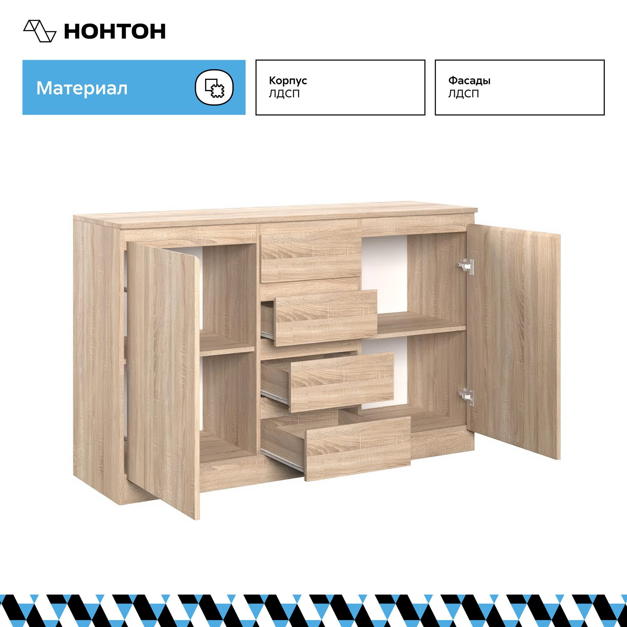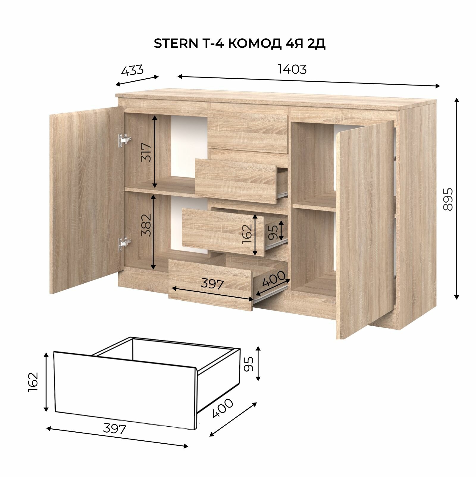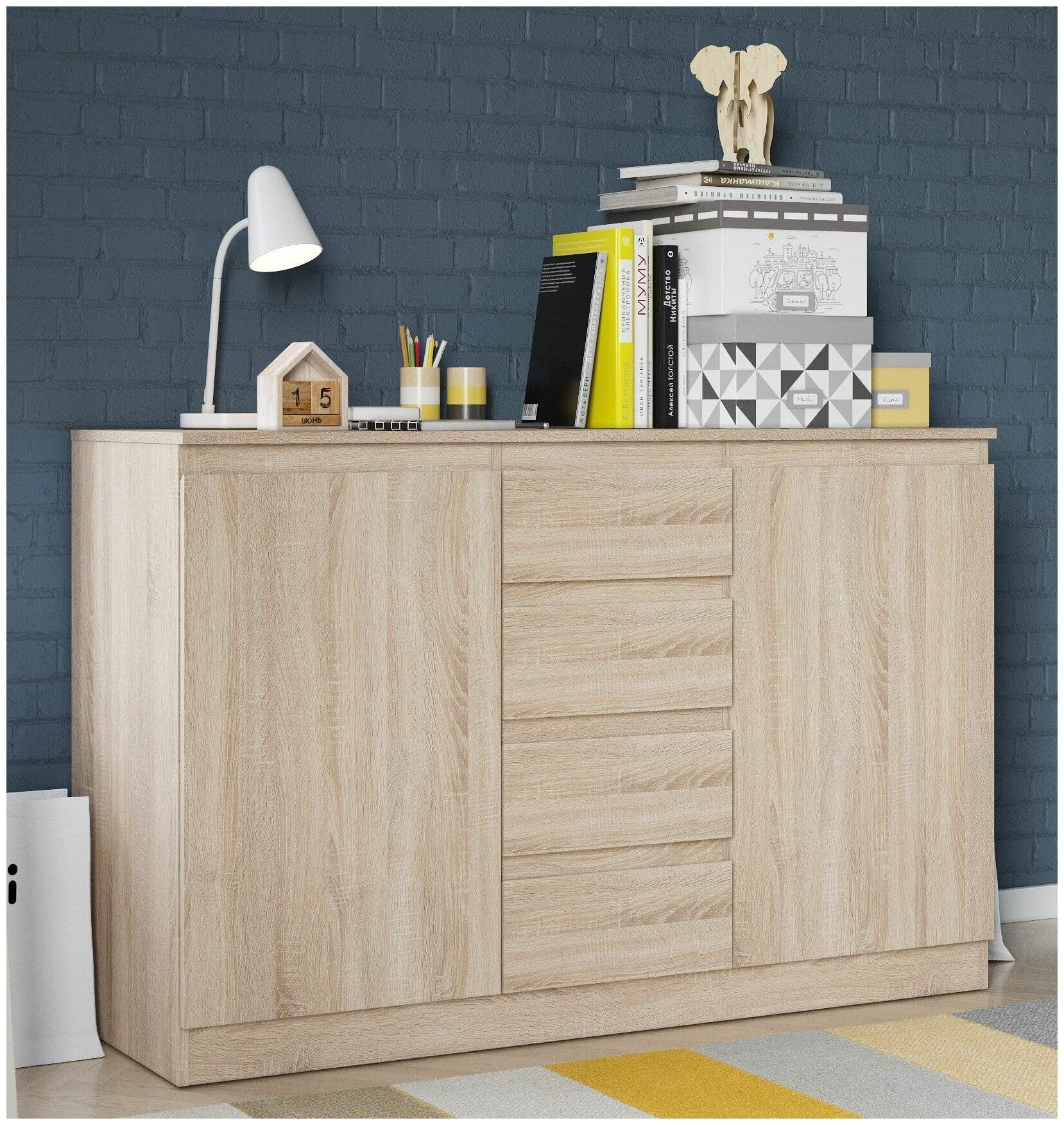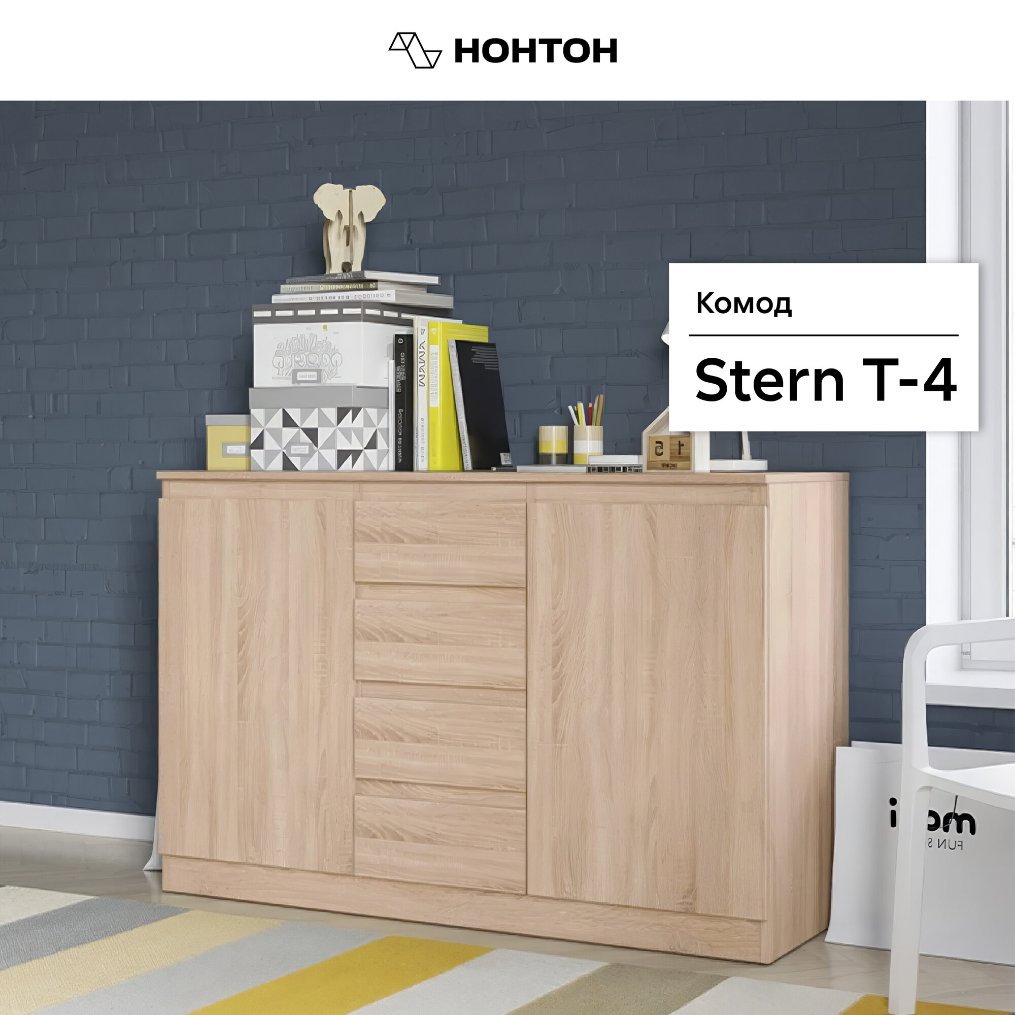 Штерн (STERN) комод Т-4, 140,3 х 89,5 х 43,3 см, 4 ящика, 2 двери, ЛДСП, Дуб Сонома