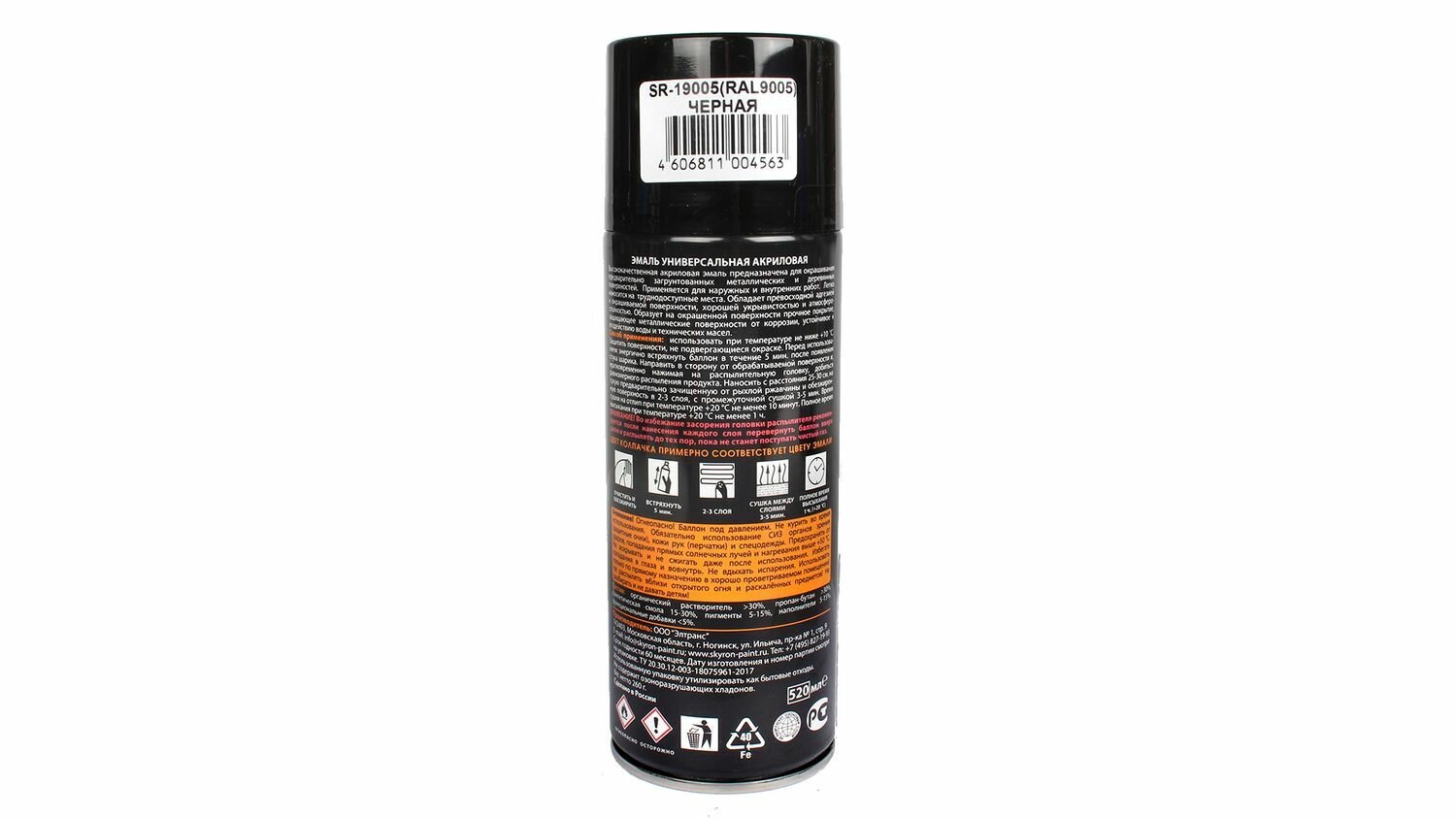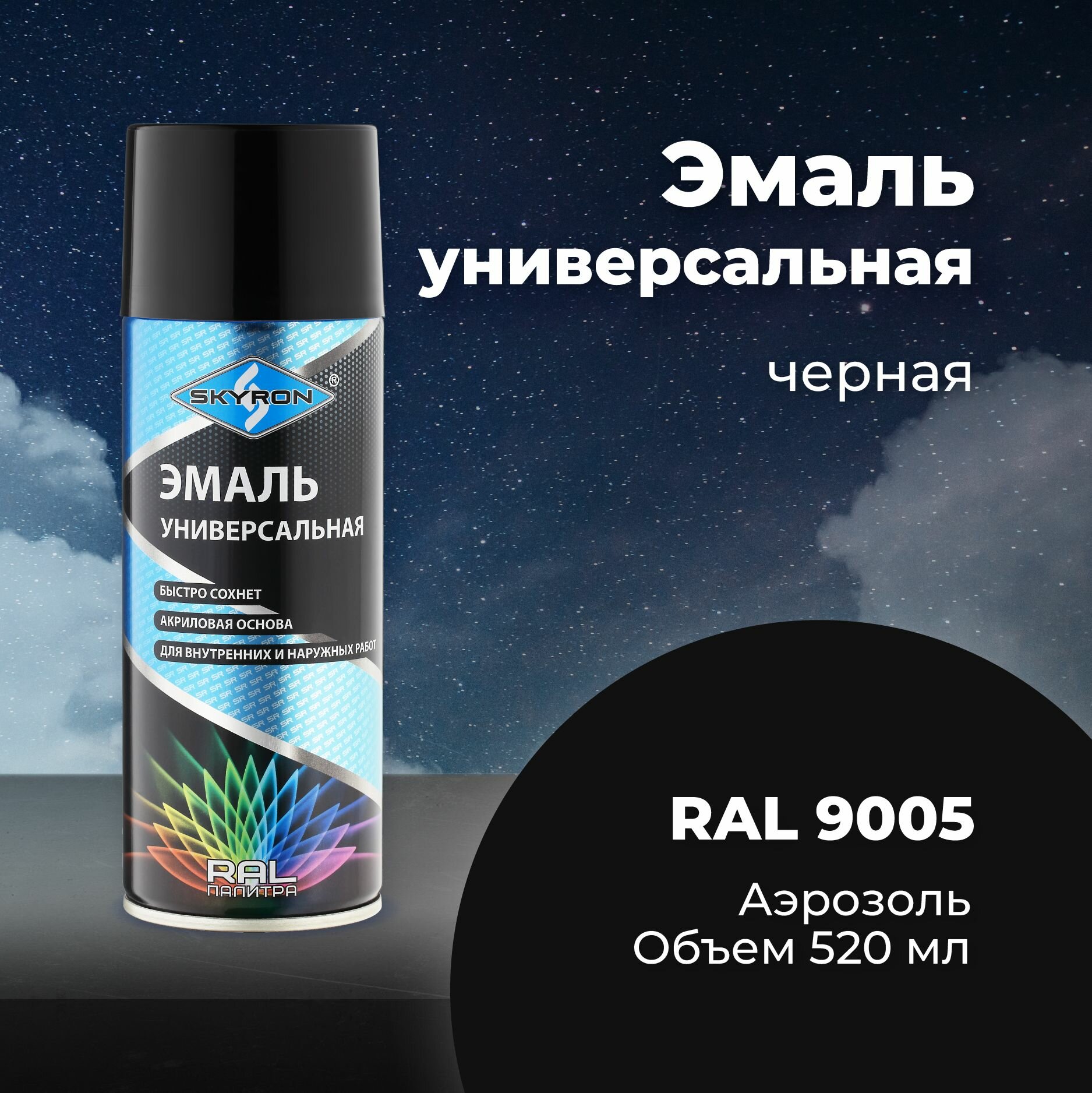 SKYRON SR-19005 Краска акриловая 520мл - RAL 9005 черная универсальная эмаль, аэрозоль