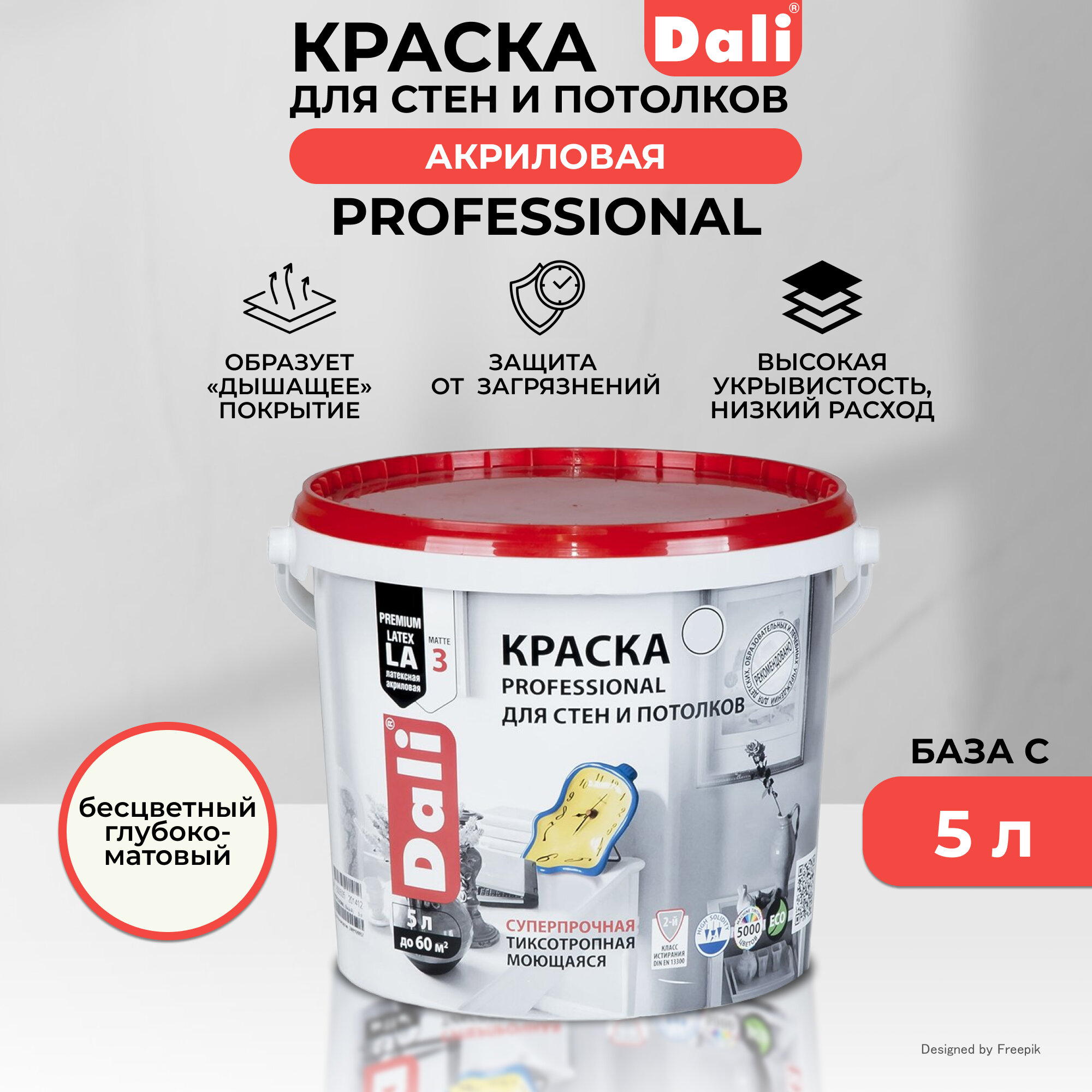 Краска для стен и потолков Dali Professional, акриловая, глубокоматовая, база C, бесцветная, 5 л