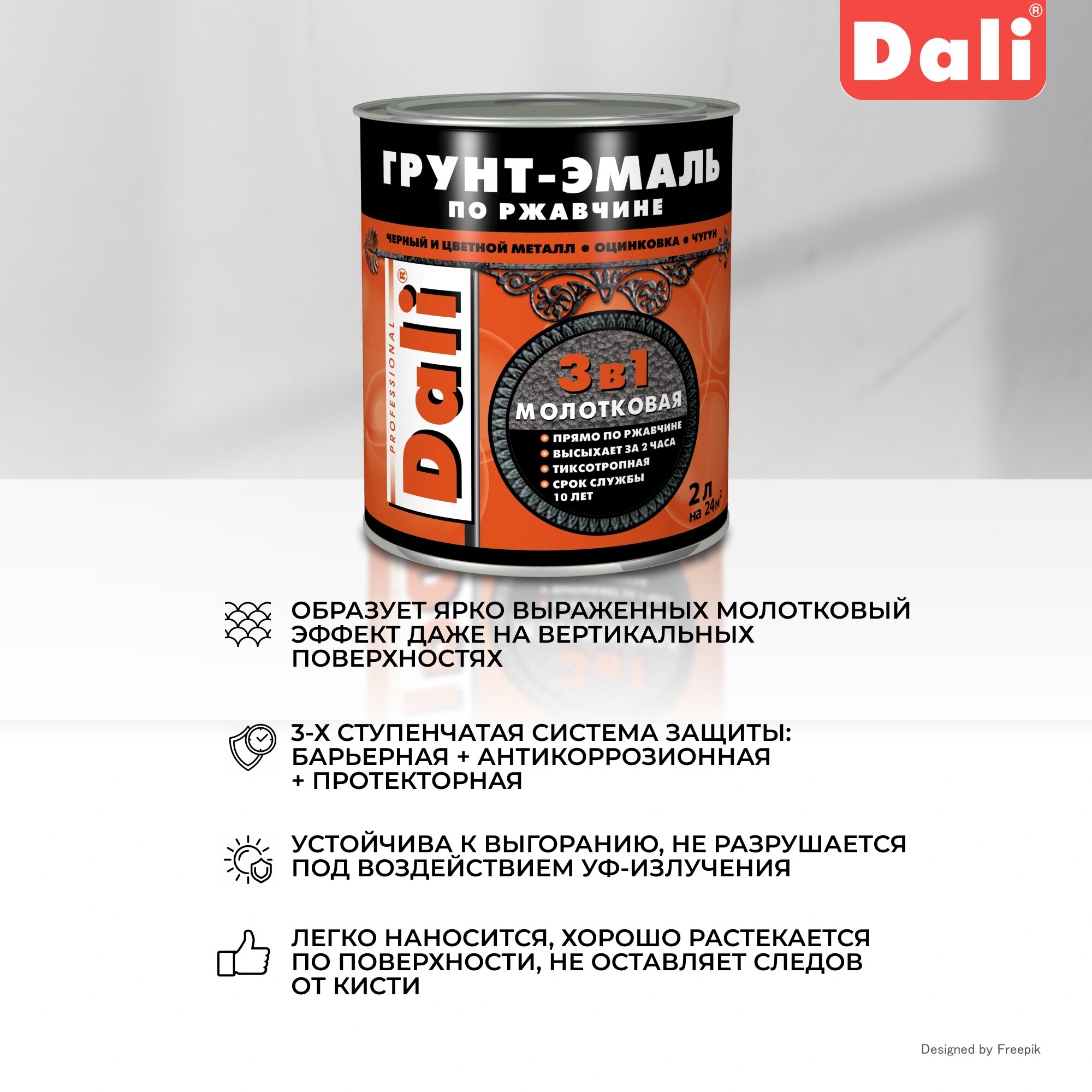 Dali / Дали Грунт-эмаль по ржавчине 3 в 1 молотковая алкидная серая 10л