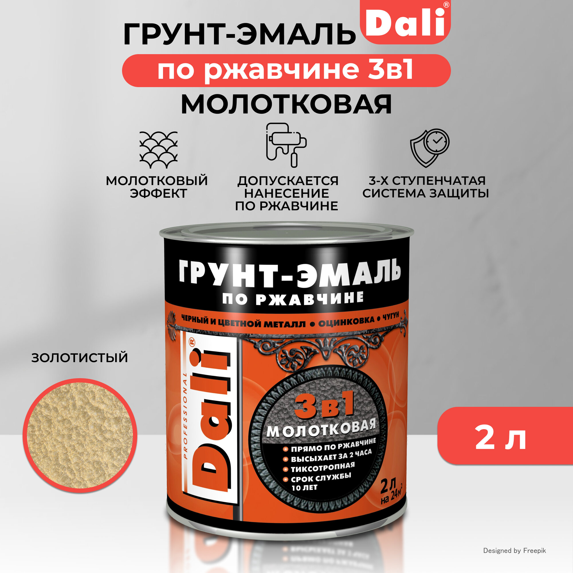 Эмаль-грунт по ржавчине 3в1 DALI молотков. золотистая 2л (Рогнеда)