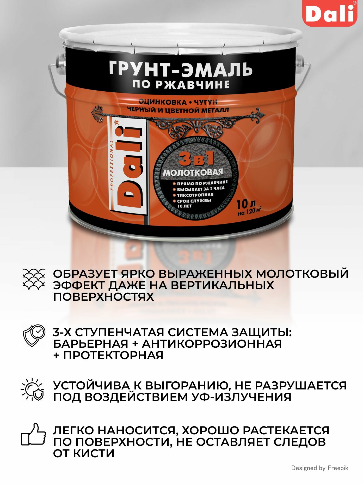 Dali / Дали Грунт-эмаль по ржавчине 3 в 1 молотковая алкидная серая 10л