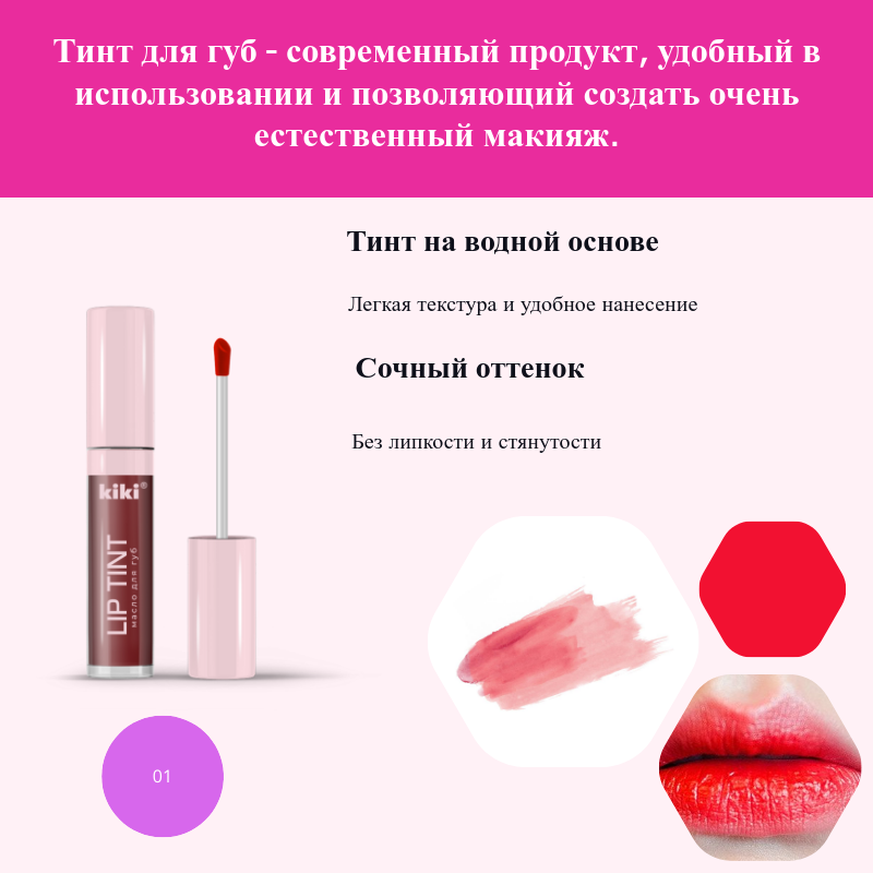 СохранитьТинт для губ Kiki Lip Tint, тон: 01 алый, 3.5мл интересное: