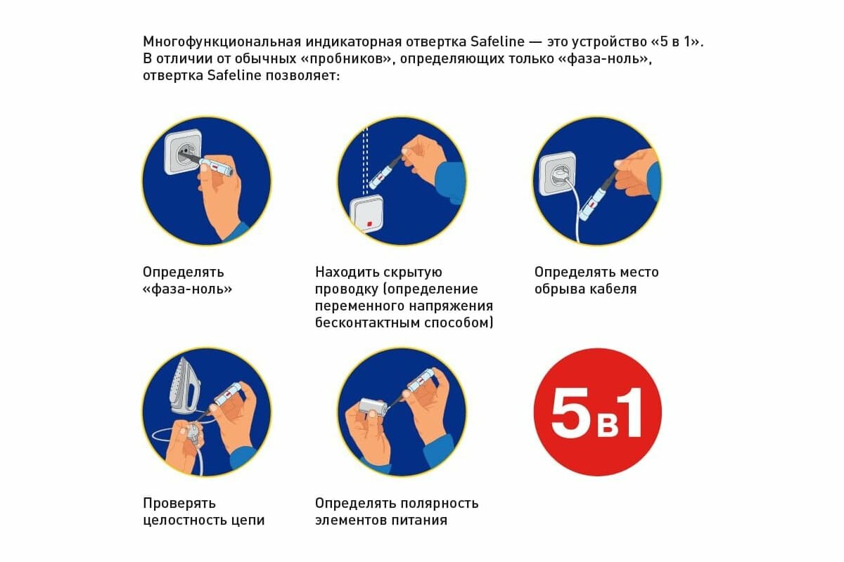 Купить Safeline отвертка индикаторная (тестер-пробник) "5 в 1" (фаза-ноль, обрыв, полярн., целост)
