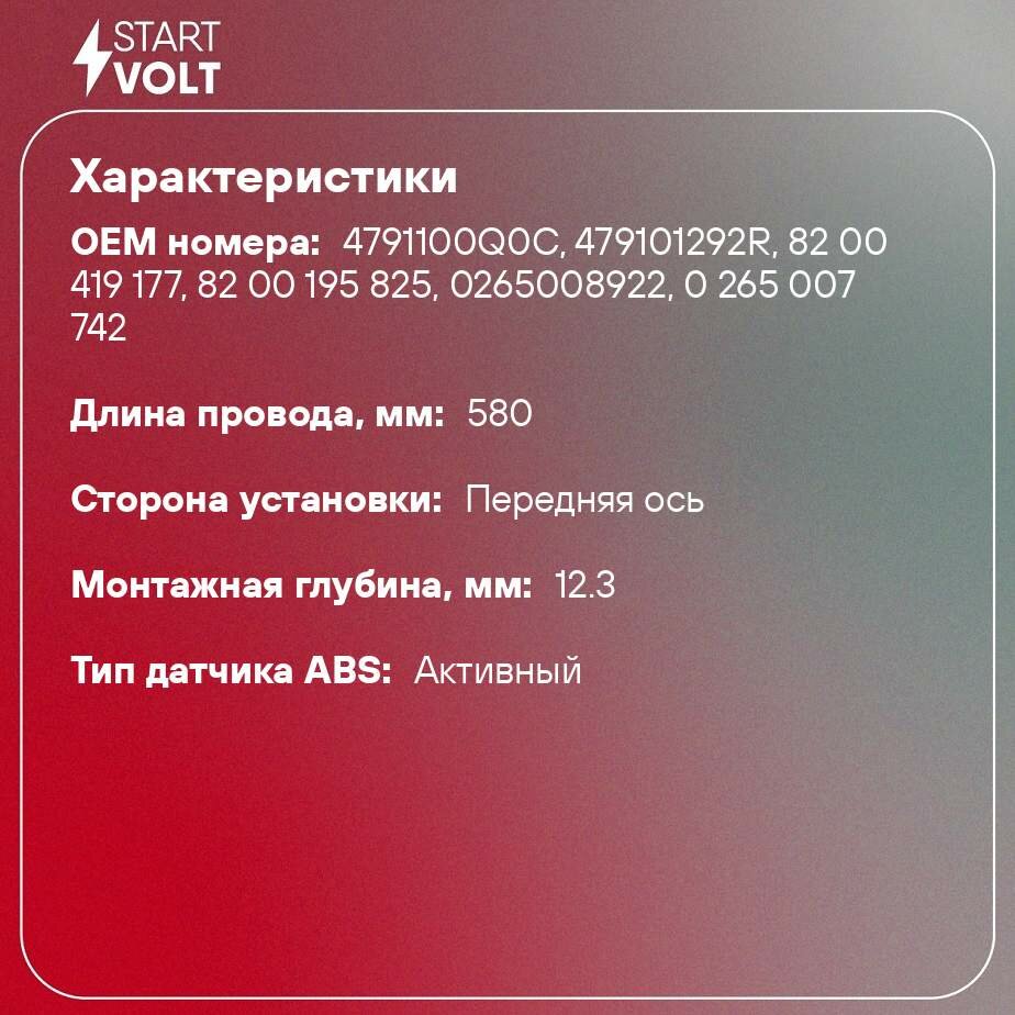 Датчик ABS для автомобилей Лада Largus (12-)/Renault/Nissan Logan (04-)/Almera (12-) переднего левого/правого колеса VS-ABS 0908 StartVolt