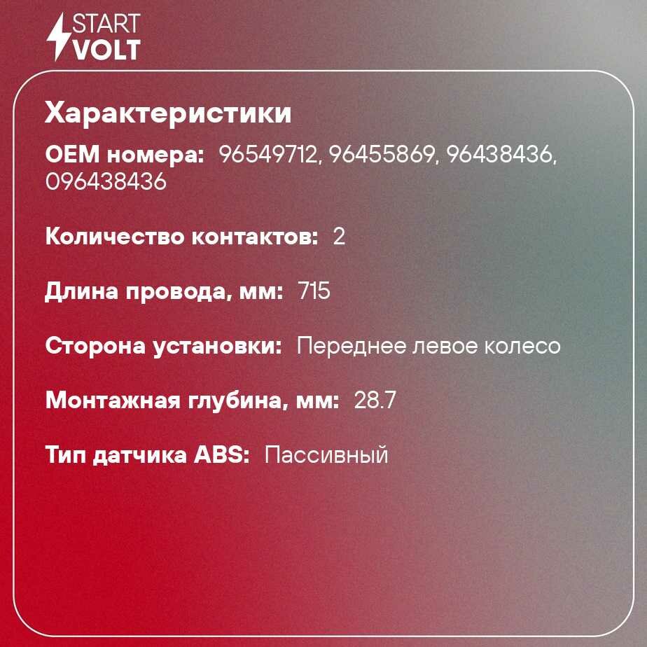 Датчик Abs Шевроле/Шевролет/Chevrolet Lacetti/Nubira/Дэу/Даеву/Daewoo Lacetti/Nubira Пер.Лев. STARTVOLT арт. VSABS0502