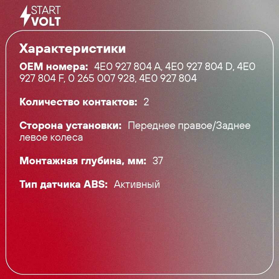 Датчик ABS для автомобилей VAG A4 (07-)/A6 (05-)/Q5 (08-) переднего правого/заднего левого колеса VS-ABS 1812 StartVolt