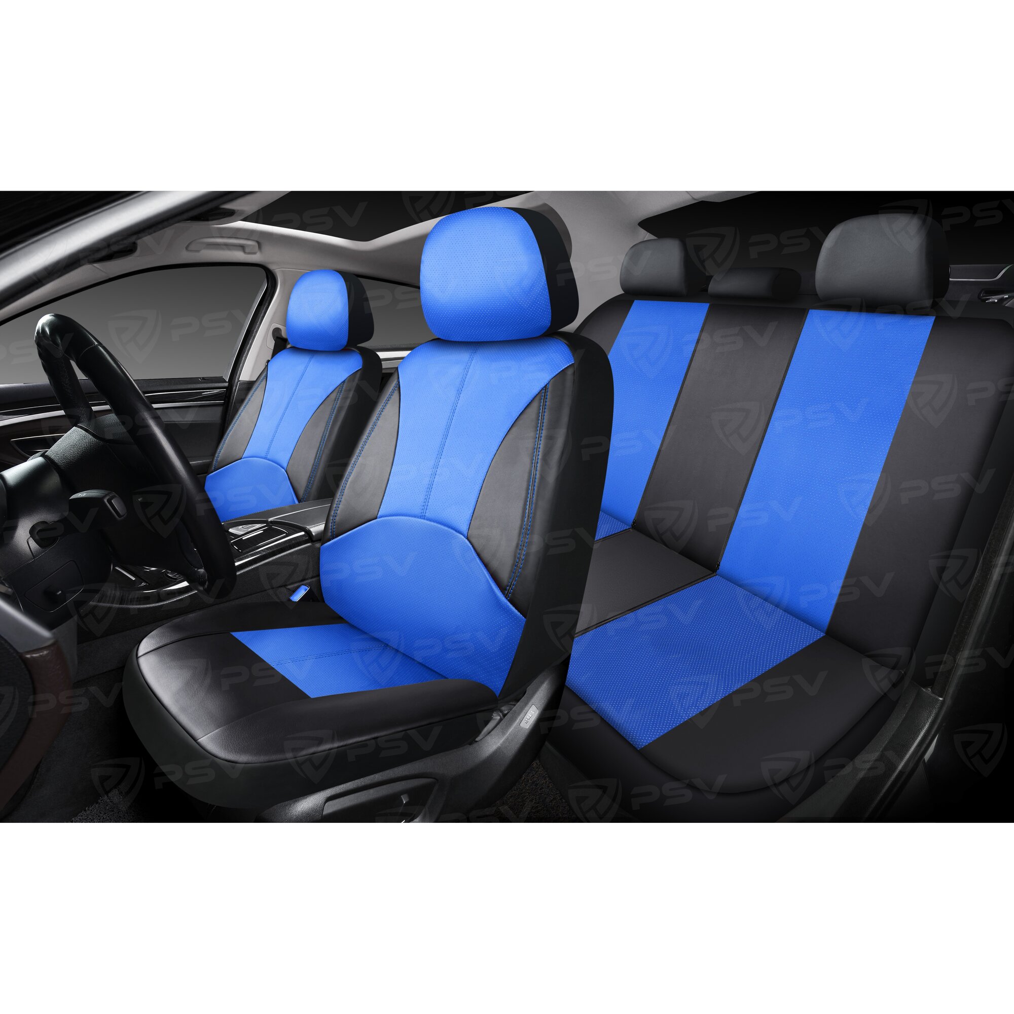 Купить Авточехлы универсальные из экокожи черные с синим PSV Imperial Next, для автомобильных сидений комплект на весь салон, 11 предметов